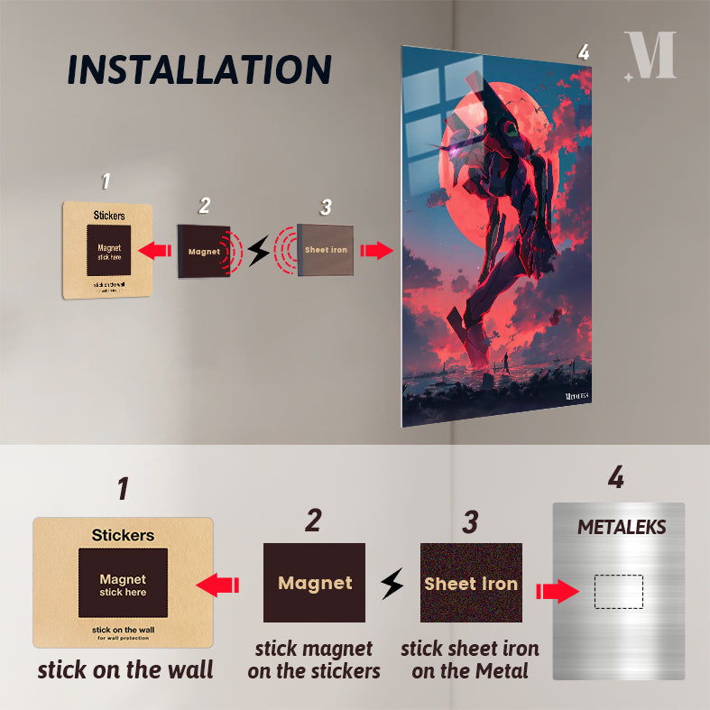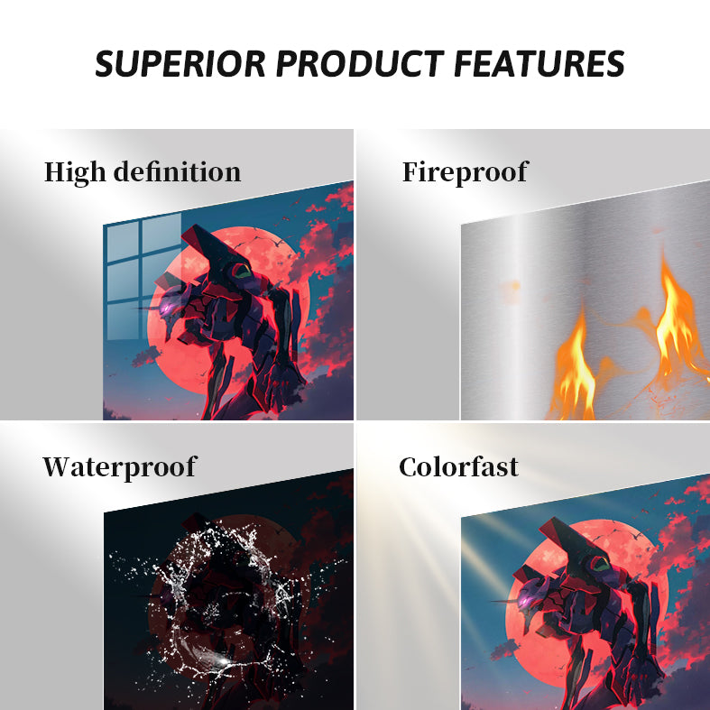 The image features a large, imposing robot from the anime “Neon Genesis Evangelion” standing against a backdrop of a red moon and dramatic clouds. The robot is in a dynamic pose, suggesting movement or readiness for action. Metaleks Ultra HD Metal Poster – Create Your Passionate Space.
