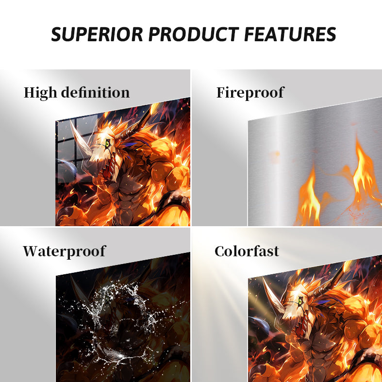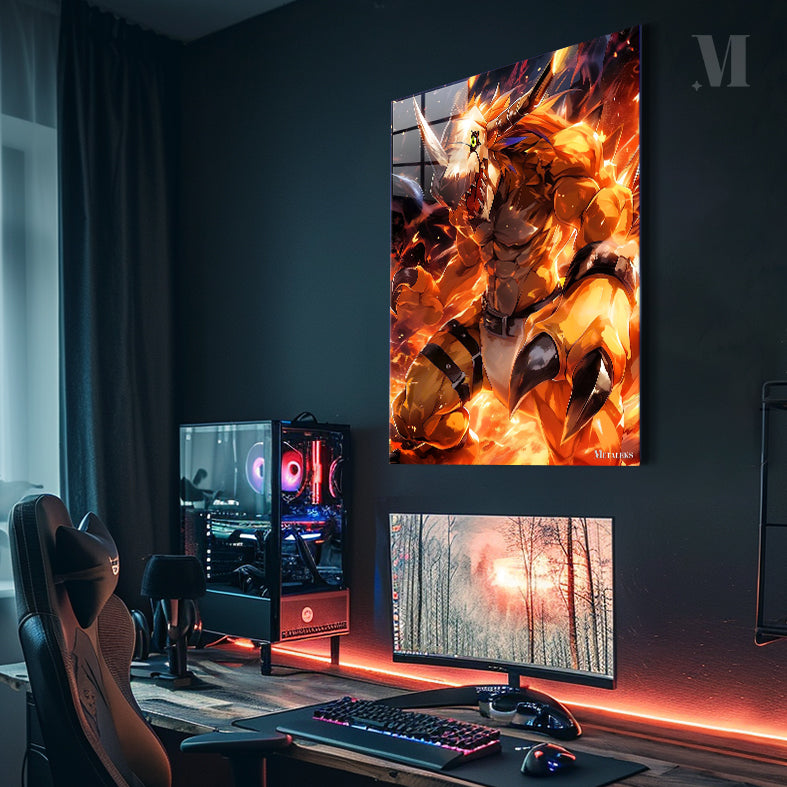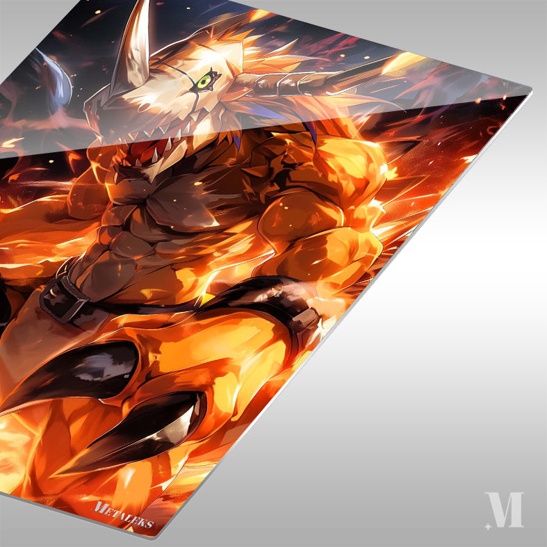 A fierce, muscular Digimon with a horned helmet and glowing green eyes, surrounded by flames. Metaleks Ultra HD Metal Poster – Create Your Passionate Space.