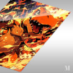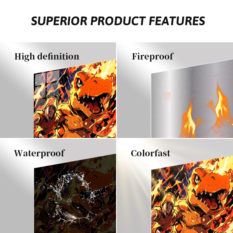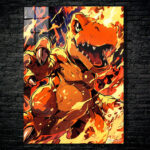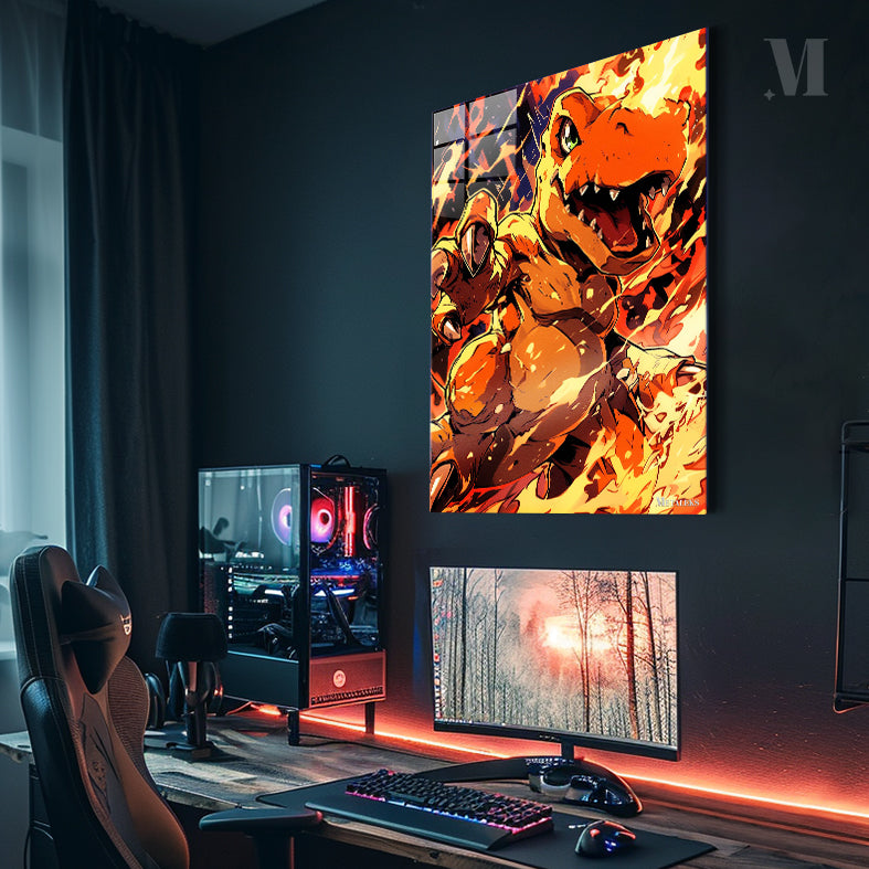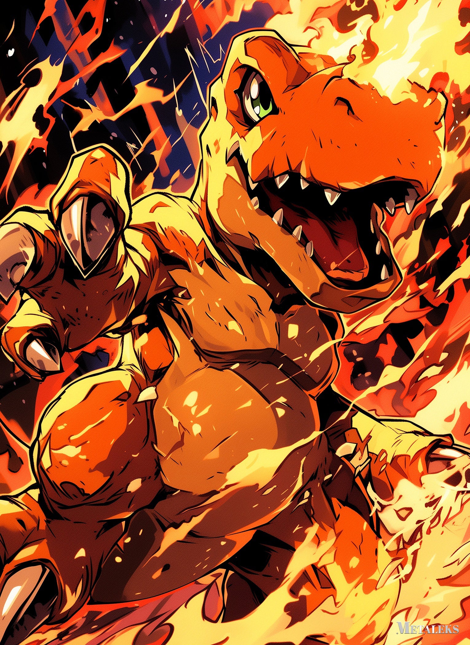 A large, orange dinosaur-like creature with green eyes is surrounded by flames. It has sharp teeth and claws, and its mouth is open as if roaring. Metaleks Ultra HD Metal Poster – Create Your Passionate Space.