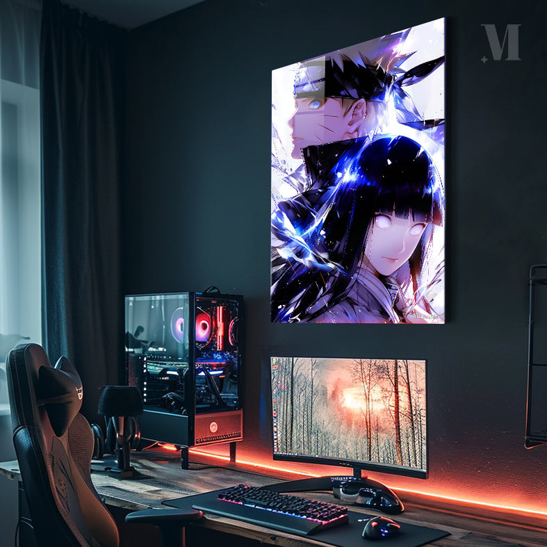 Naruto Uzumaki and Hinata Hyuga from the anime Naruto are depicted with glowing eyes and surrounded by blue energy. Metaleks Ultra HD Metal Poster – Create Your Passionate Space.