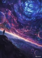 A person stands on a cliff, gazing at a vibrant, swirling galaxy filled with stars and cosmic phenomena. Metaleks Ultra HD Metal Poster – Create Your Passionate Space.