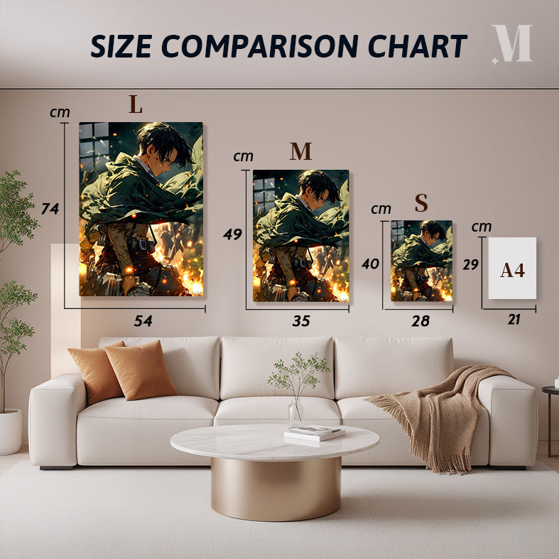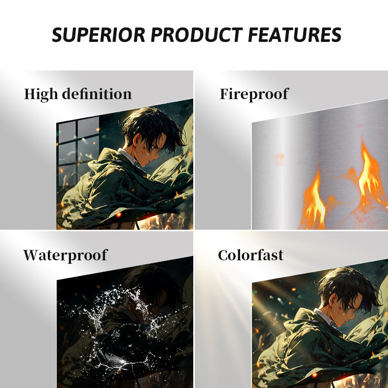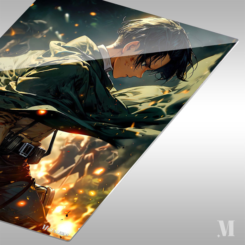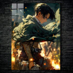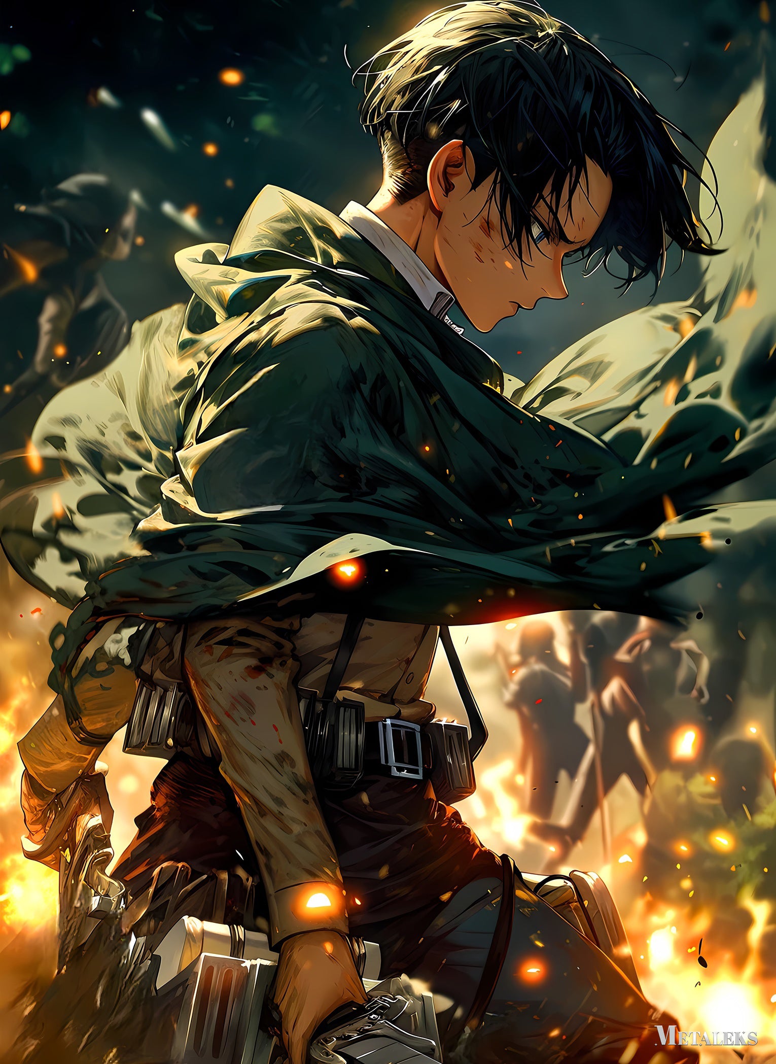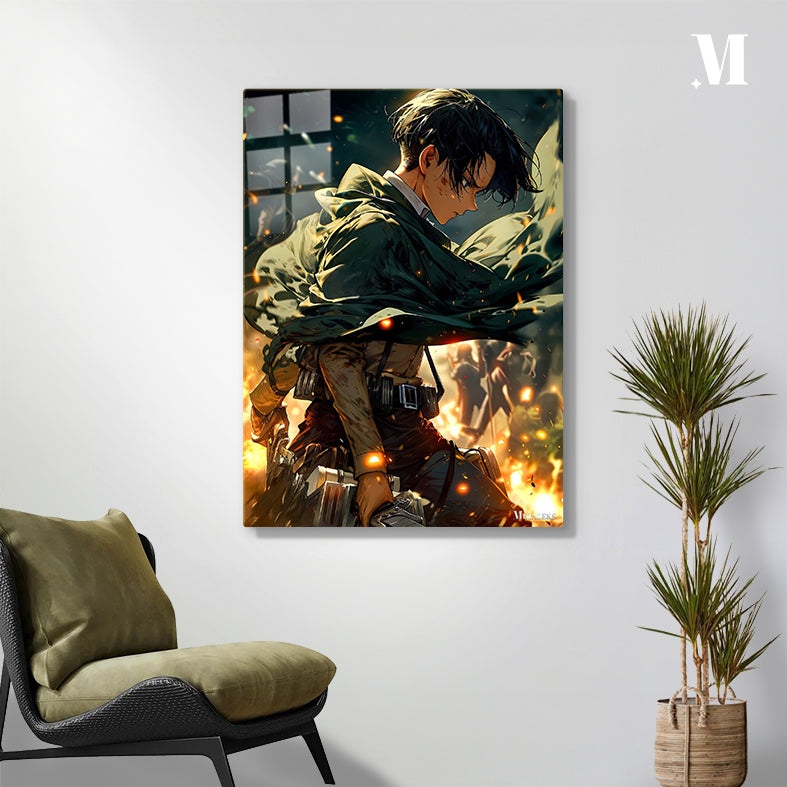 Levi Ackerman from Attack on Titan, with short black hair, wearing a green cloak and combat gear, stands amidst a fiery, chaotic scene. Metaleks Ultra HD Metal Poster – Create Your Passionate Space.
