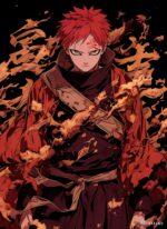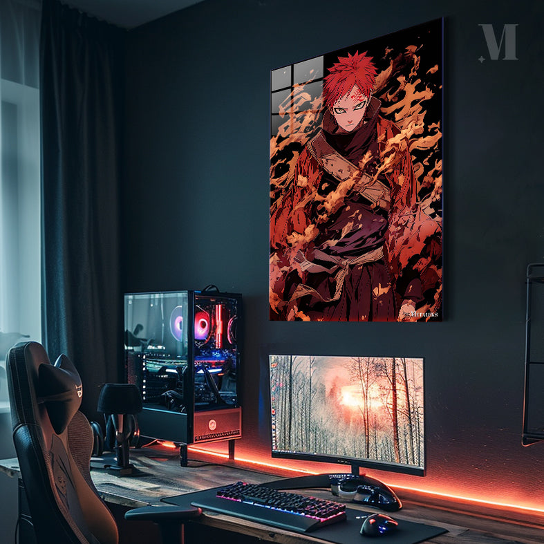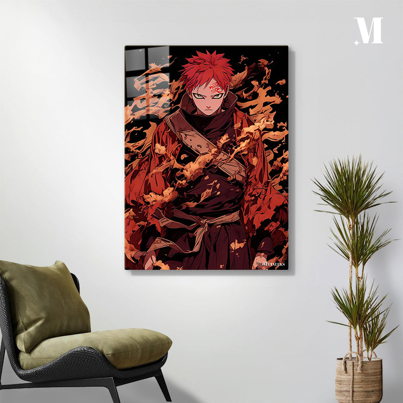 Gaara from Naruto, with red hair and a forehead tattoo, stands amidst swirling sand. Metaleks Ultra HD Metal Poster – Create Your Passionate Space.