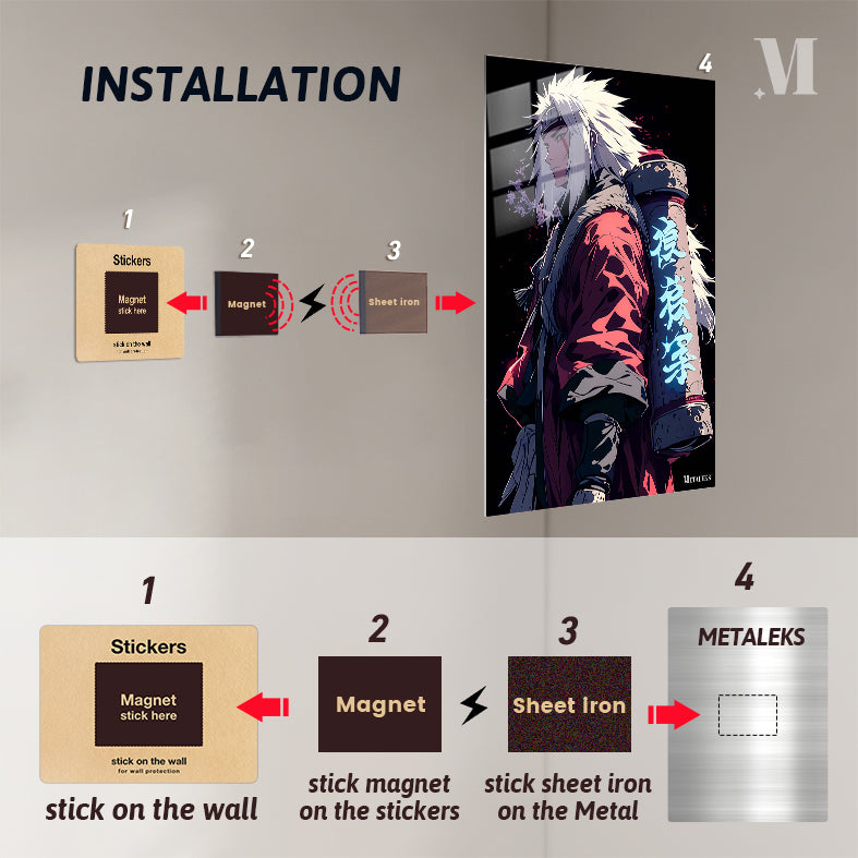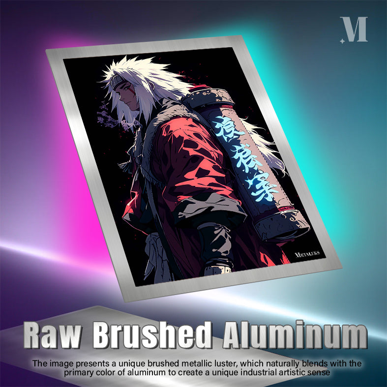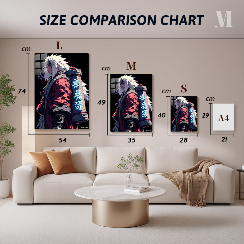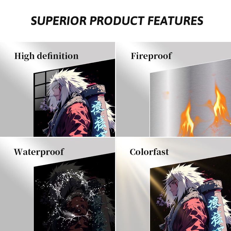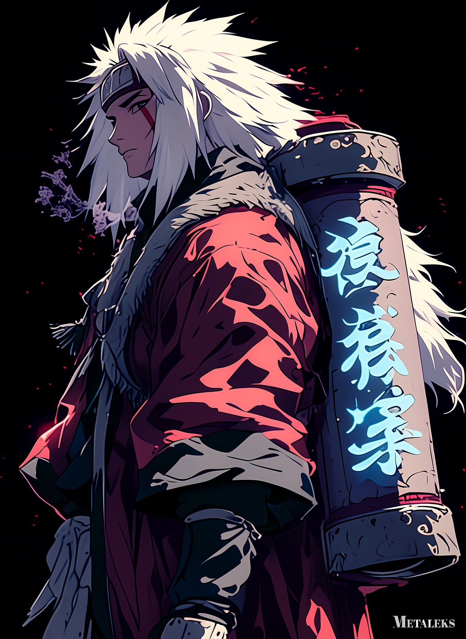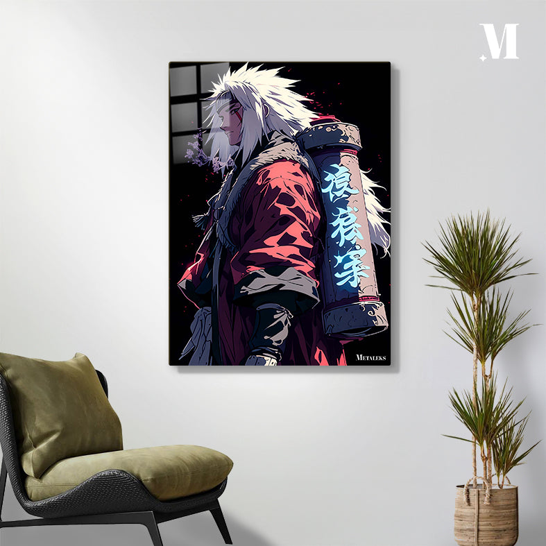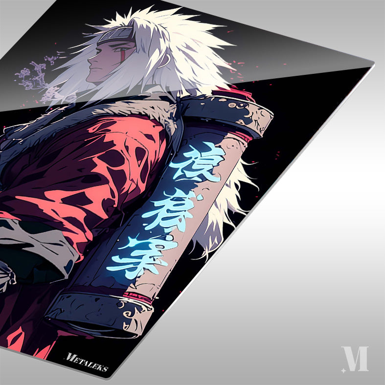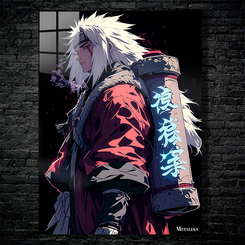 Jiraiya from the anime “Naruto” is depicted with spiky white hair, wearing a red cloak with fur trim, and carrying a large scroll on his back with glowing blue kanji. Metaleks Ultra HD Metal Poster – Create Your Passionate Space.