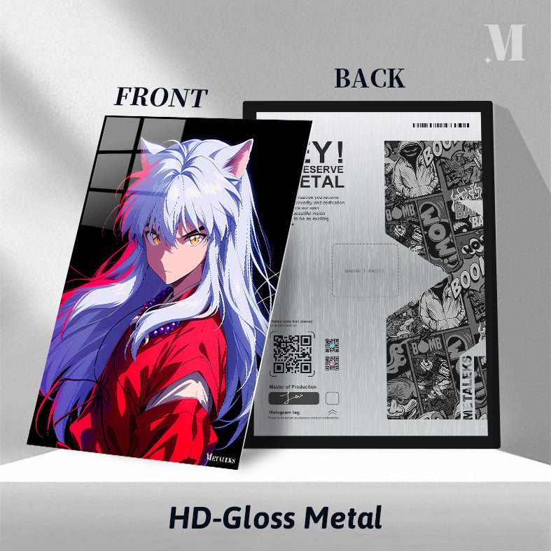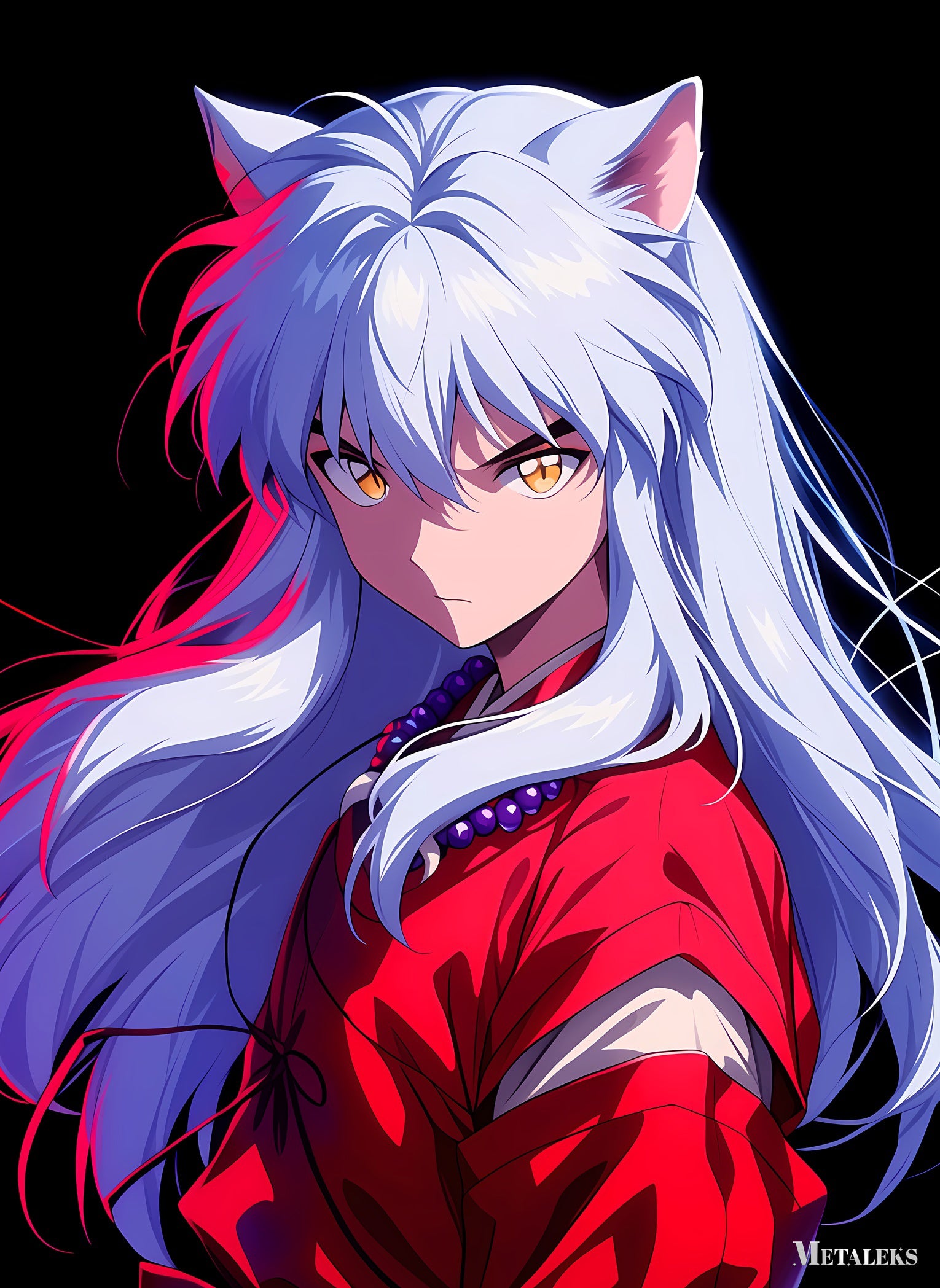 Inuyasha, a character from the anime “Inuyasha,” has long silver hair with pink highlights, cat ears, and wears a red robe with a purple bead necklace. Metaleks Ultra HD Metal Poster – Create Your Passionate Space.