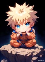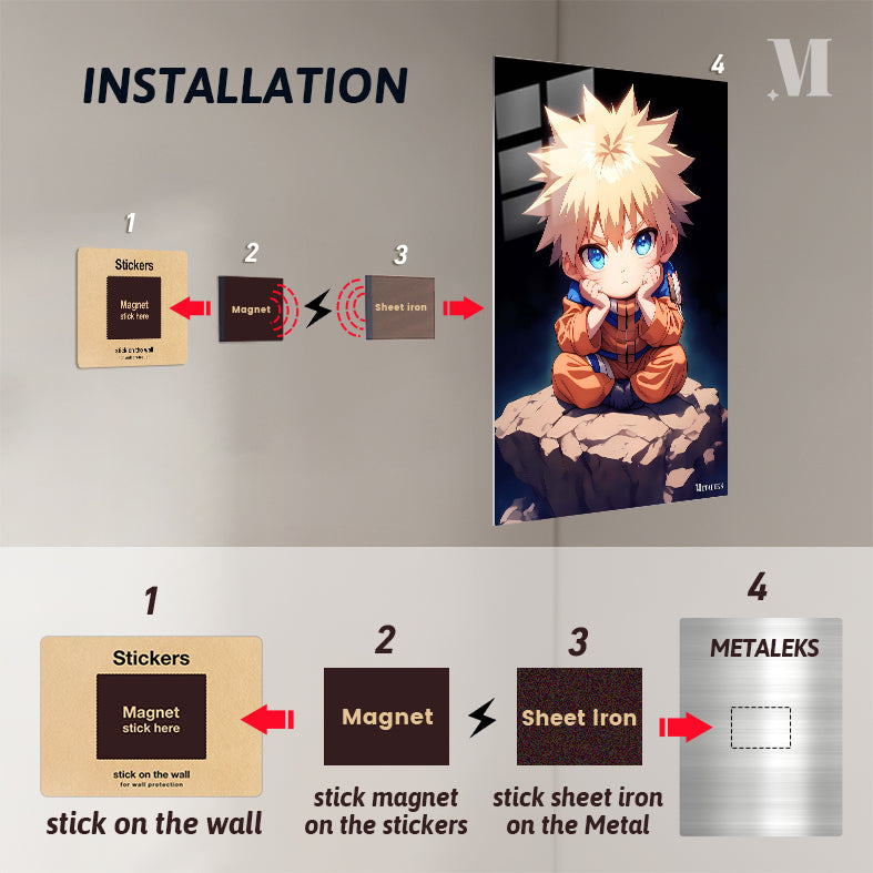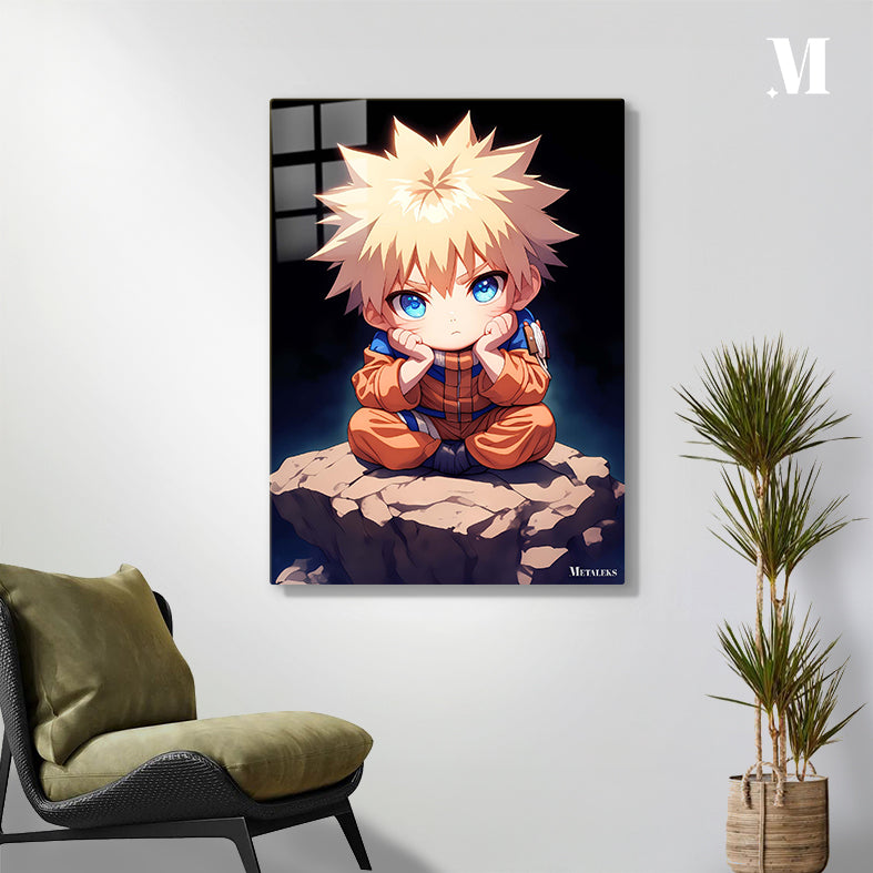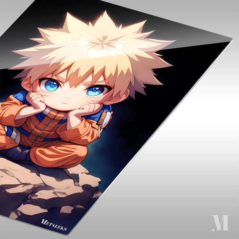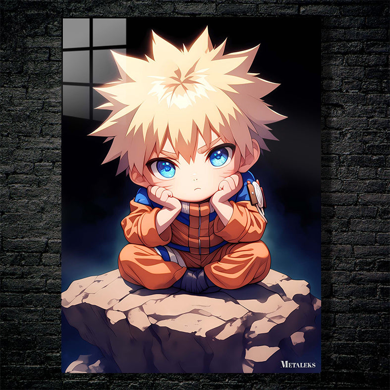 Naruto Uzumaki from the anime “Naruto” is sitting cross-legged on a rock, with his hands resting on his cheeks. Metaleks Ultra HD Metal Poster – Create Your Passionate Space.