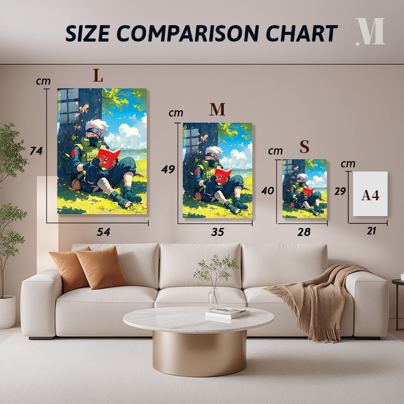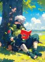 Hatake Kakashi from the anime “Naruto” is sitting under a tree, wearing his signature outfit. He is reading a red book, “Make-Out Paradise,” with his eyes closed. Metaleks Ultra HD Metal Poster – Create Your Passionate Space.