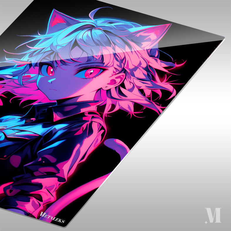 A character with cat ears and a tail, wearing a shiny jacket. The character has vibrant, wavy hair in shades of blue and pink, and striking red eyes. Metaleks Ultra HD Metal Poster – Create Your Passionate Space.