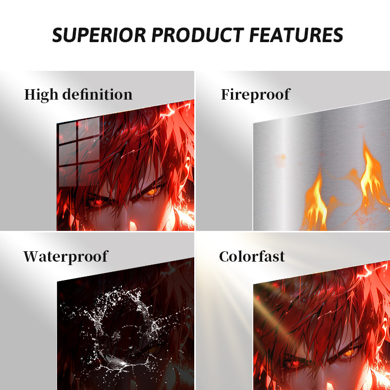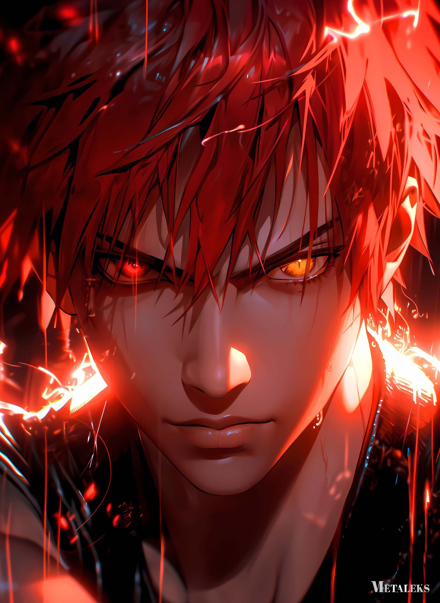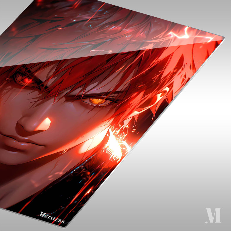 The image features a character with red hair, one eye glowing red and the other glowing yellow, surrounded by red energy effects. Metaleks Ultra HD Metal Poster – Create Your Passionate Space.