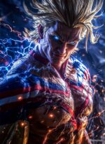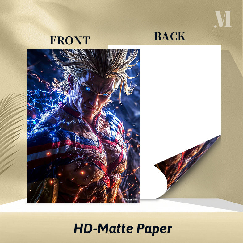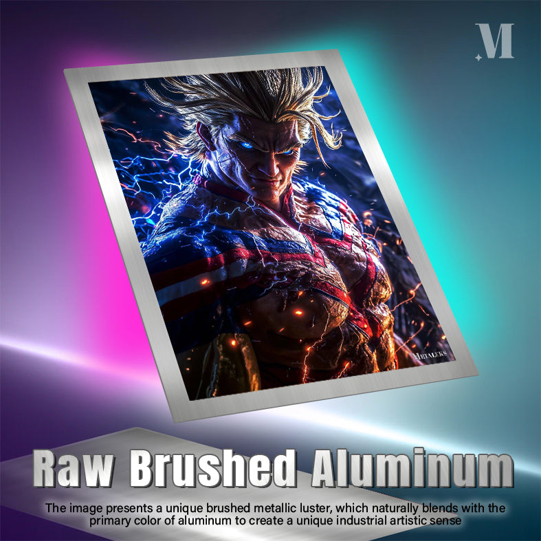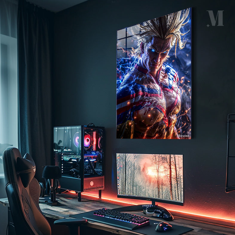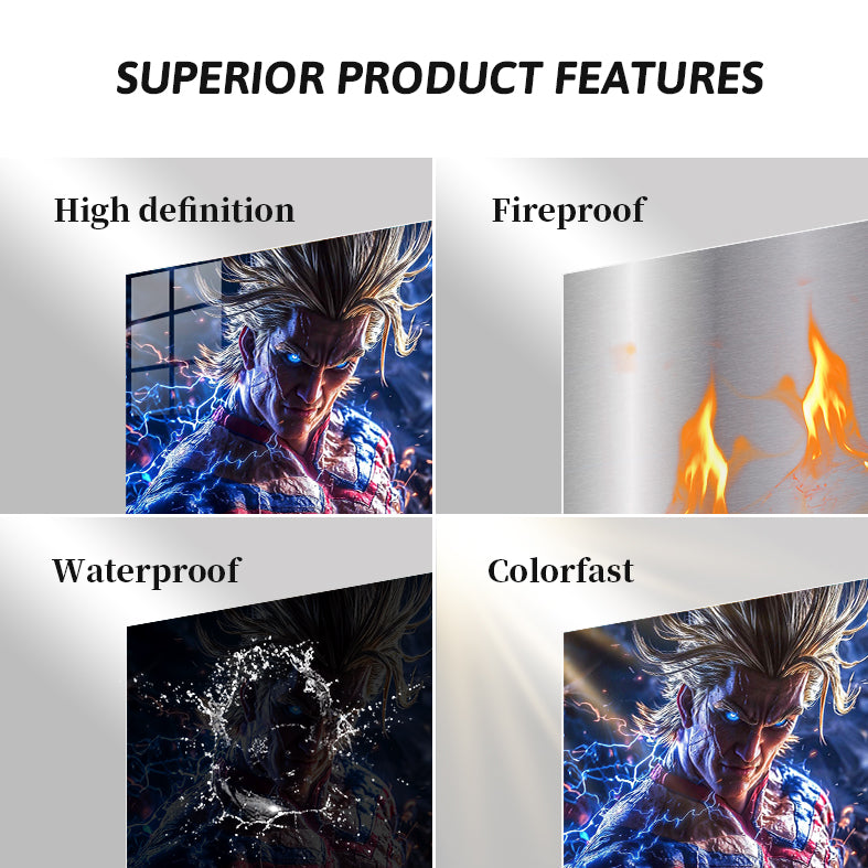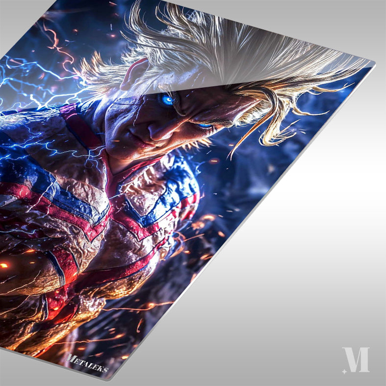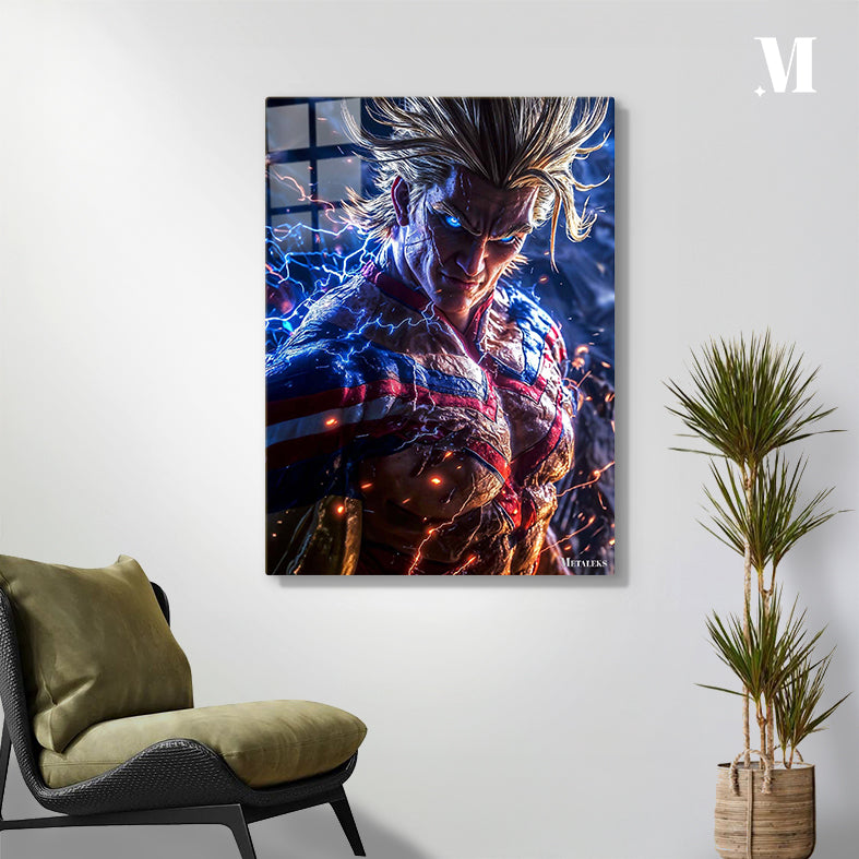 All Might from “My Hero Academia” is shown with his iconic spiky blonde hair, glowing blue eyes, and muscular build. He is wearing his signature red, white, and blue hero costume, which is emitting electric sparks. Metaleks Ultra HD Metal Poster – Create Your Passionate Space.