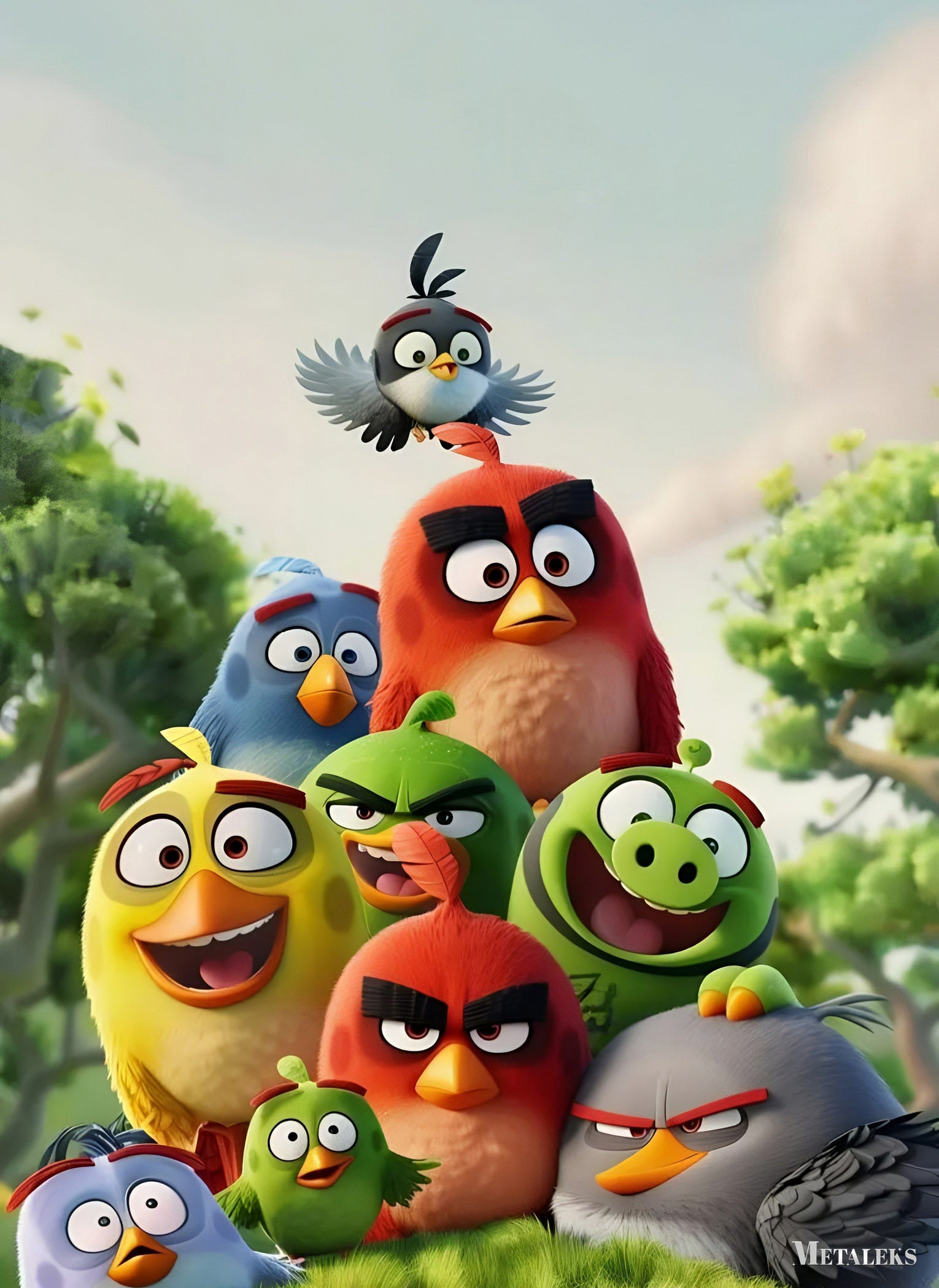 The image shows a group of characters from “Angry Birds” stacked in a pyramid formation. At the top is Bomb, a black bird with white wings. Below him is Red, the main character, a large red bird with thick eyebrows. The rest of the group includes Chuck, a yellow bird with a wide smile; Blues, three small blue birds; Matilda, a white bird; Hal, a green bird with a boomerang beak; and Terence, a large red bird with a stern expression. There is also one pig.