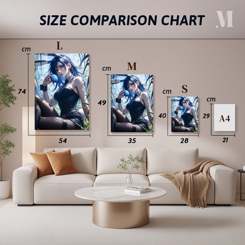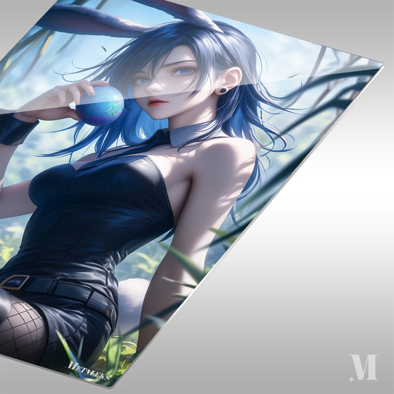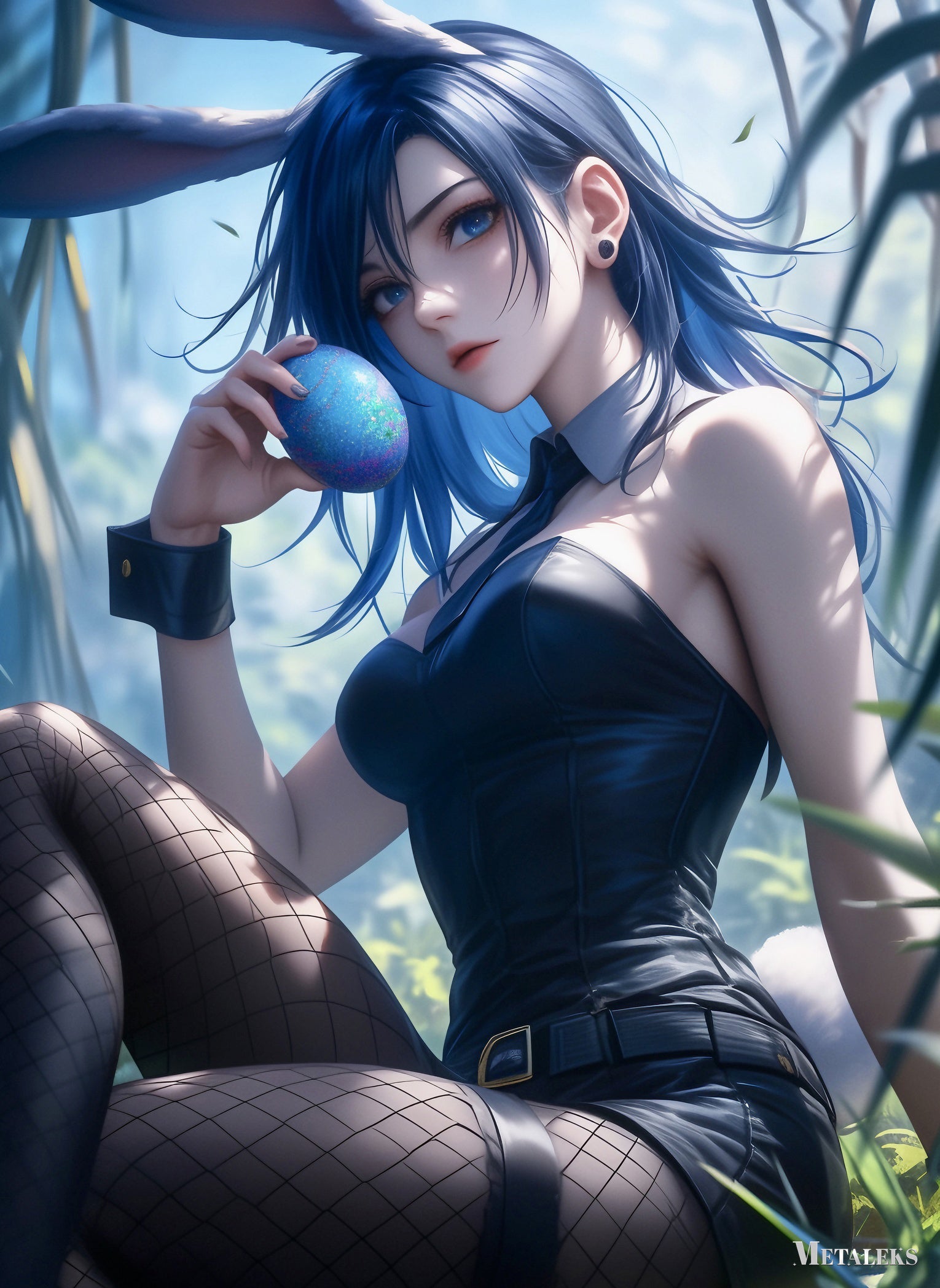 A girl with blue hair and rabbit ears, wearing a black outfit and fishnet stockings, holds a blue egg. Metaleks Ultra HD Metal Poster – Create Your Passionate Space.