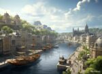 A river runs through a picturesque city with tall buildings and a bridge in the distance. Several ships are docked along the river, and people are walking along the riverbank. Metaleks Ultra HD Metal Poster – Create Your Passionate Space.