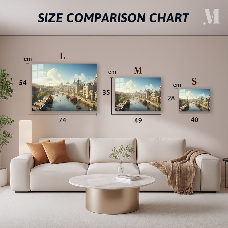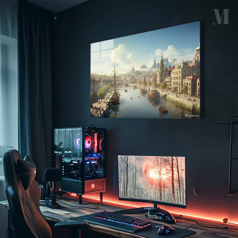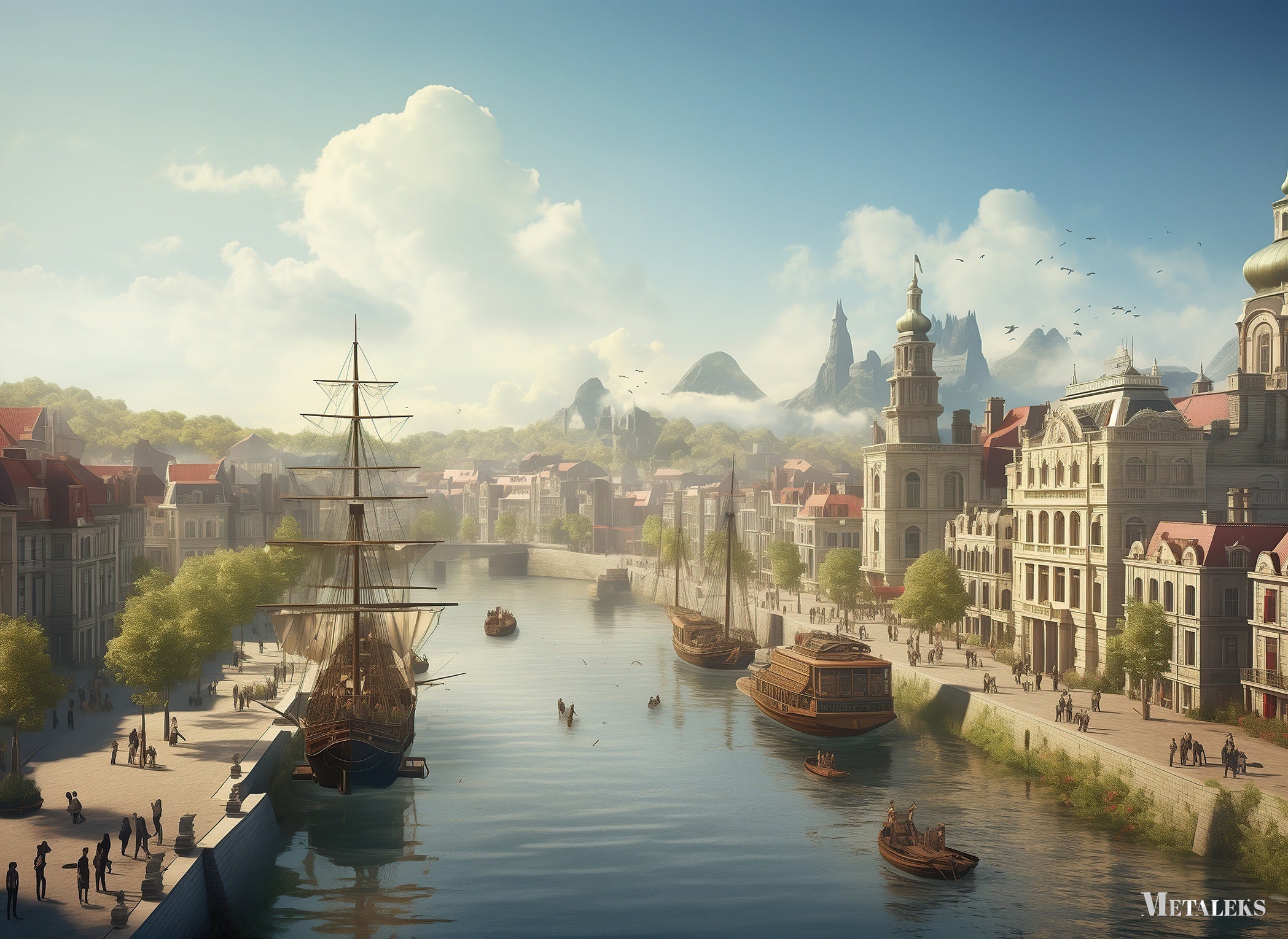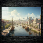 The image depicts a serene riverside town with several ships docked along the river. There are people walking along the riverbanks and small boats on the water. The town features buildings with distinct architectural styles, and there are mountains in the background under a partly cloudy sky. Metaleks Ultra HD Metal Poster – Create Your Passionate Space.