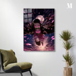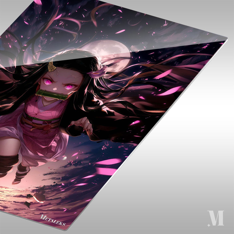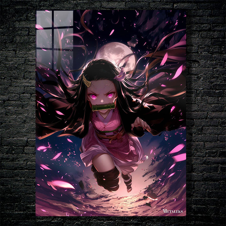 In the image, Nezuko Kamado from the anime “Demon Slayer” is depicted in mid-air. She has long black hair adorned with a pink hair accessory. Her eyes are glowing pink, and she has a bamboo muzzle in her mouth. She is wearing a pink kimono with a green obi and black leg wraps. The scene is dynamic, with pink petals and swirling dark colors in the background. Metaleks Ultra HD Metal Poster – Create Your Passionate Space.