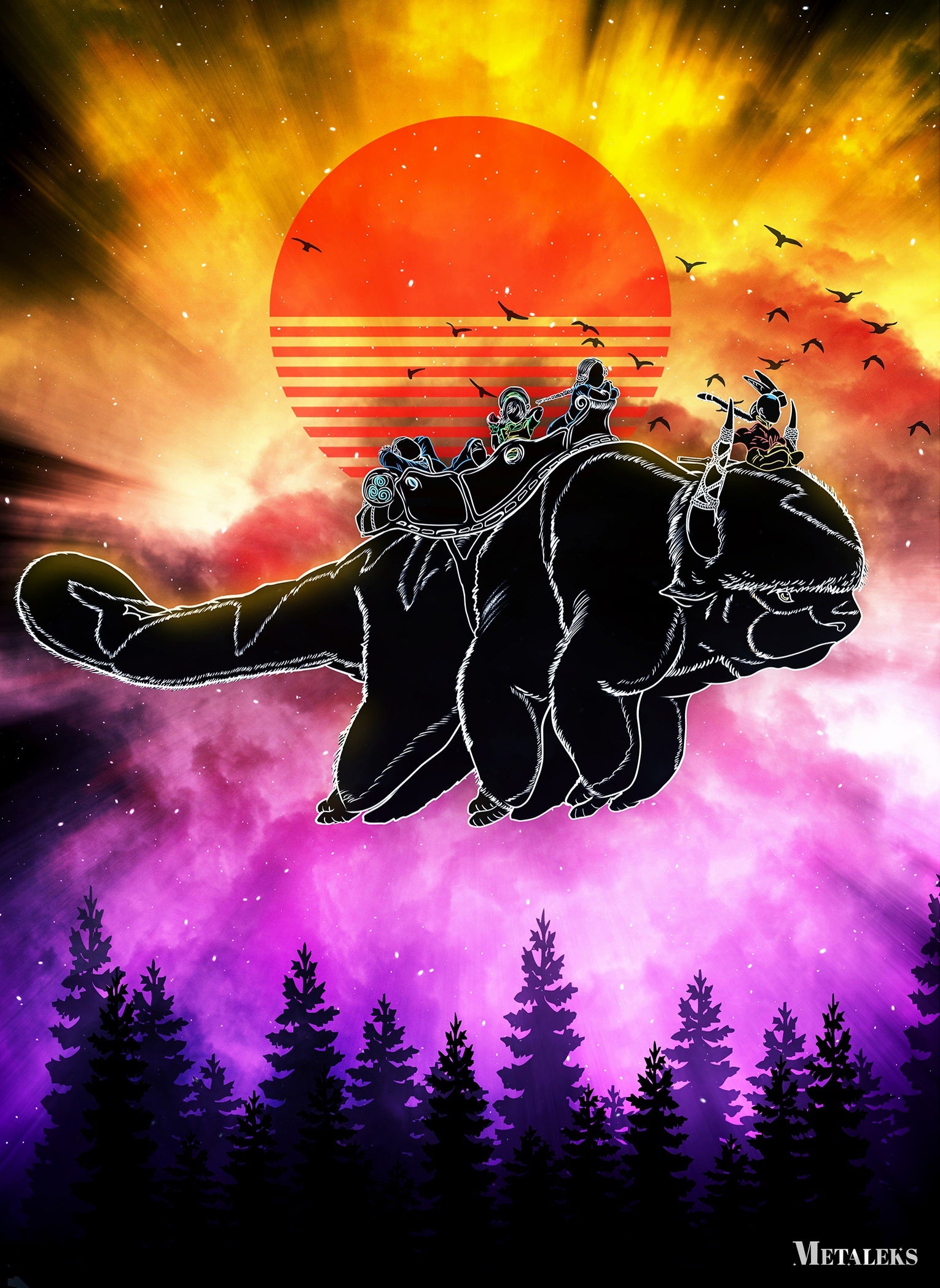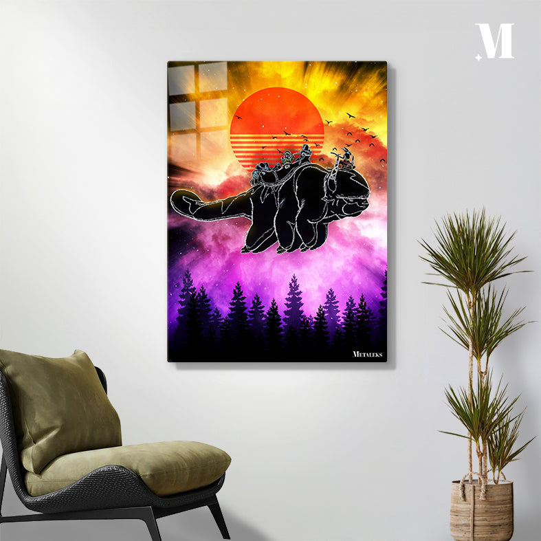 The image features Appa, the flying bison from Avatar: The Last Airbender, carrying three passengers. The passengers include Aang, Katara, and Sokka. They are depicted in a stylized, artistic manner against a vibrant, colorful background. Metaleks Ultra HD Metal Poster – Create Your Passionate Space.