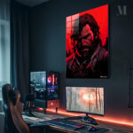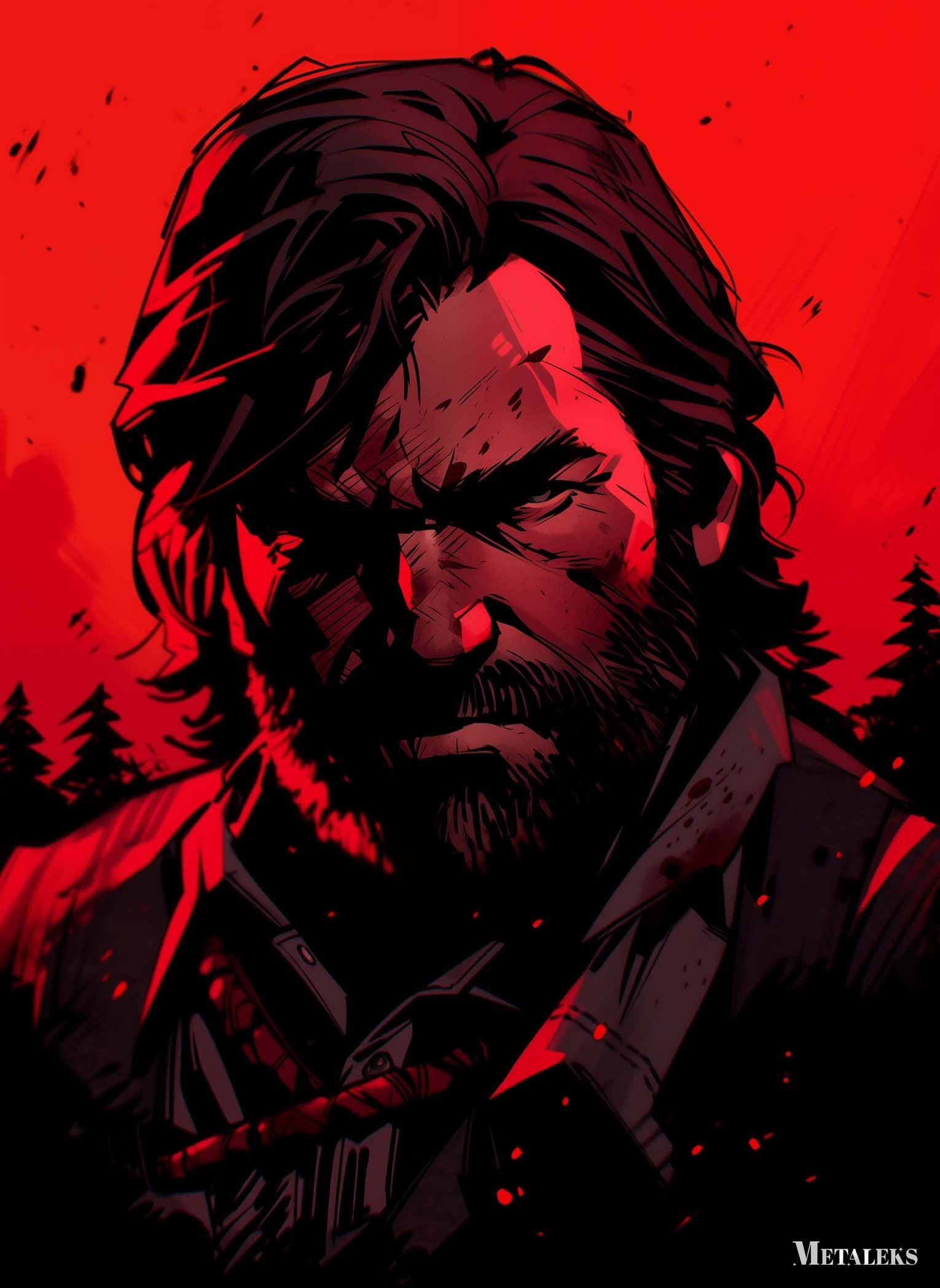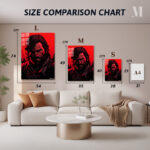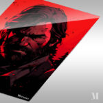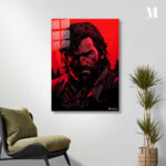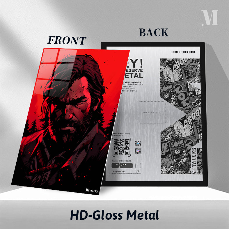 Joel from “The Last of Us” has long, dark hair and a beard. He is wearing a dark outfit with a red strap across his chest. Metaleks Ultra HD Metal Poster – Create Your Passionate Space.