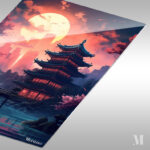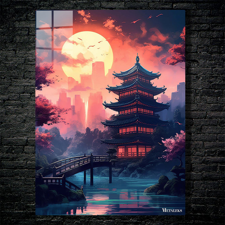 A traditional Chinese pagoda with multiple tiers stands beside a calm body of water. A wooden bridge spans the water, connecting to the pagoda. Cherry blossom trees with pink foliage frame the scene. A large, glowing sun sets behind a cityscape in the background, casting a warm, pinkish-orange hue over the entire image. Birds fly in the sky, adding to the serene atmosphere. Metaleks Ultra HD Metal Poster – Create Your Passionate Space.