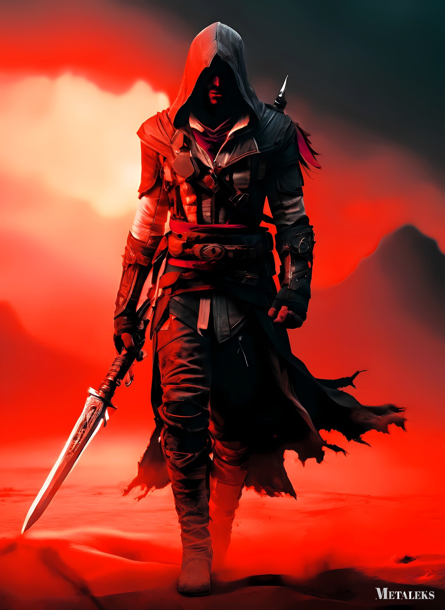 The character is dressed in a dark, hooded outfit with various belts and pouches. They are holding a large, ornate sword in their right hand. Metaleks Ultra HD Metal Poster – Create Your Passionate Space.