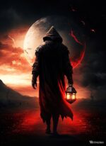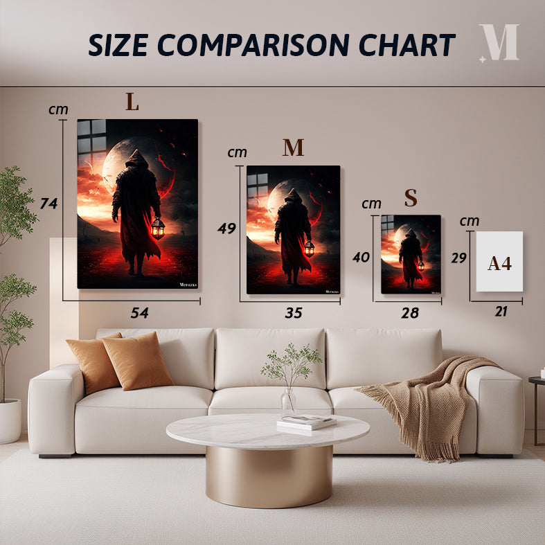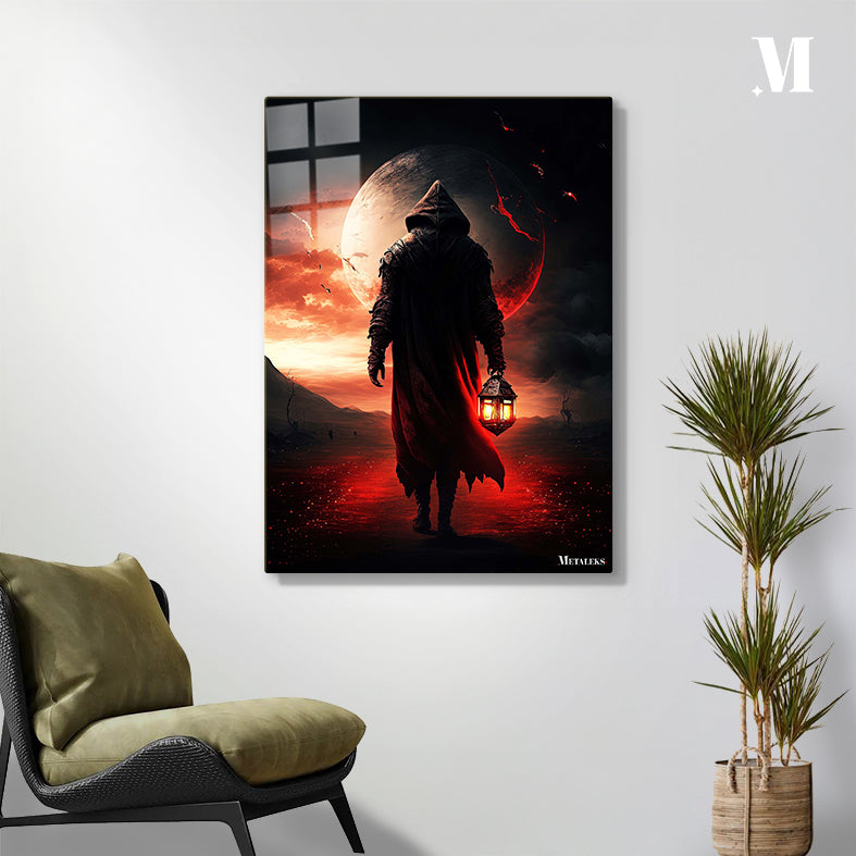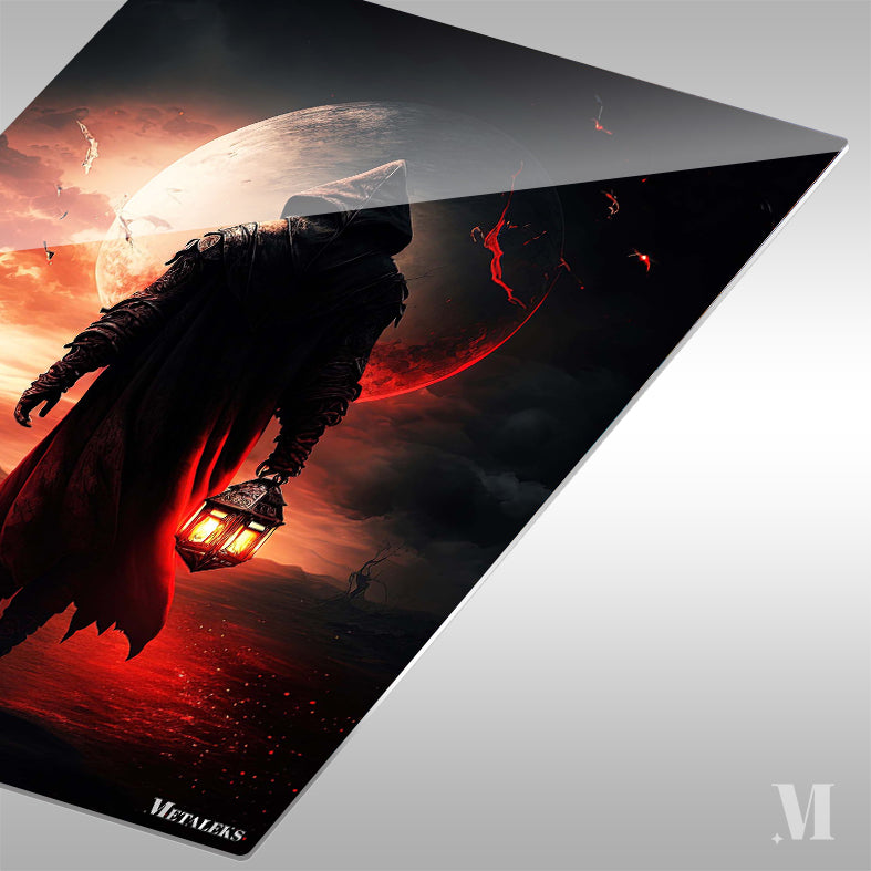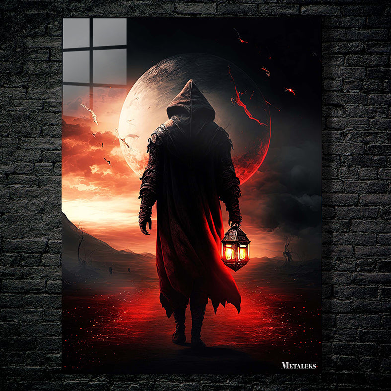 A person wearing a dark hooded cloak holds a lantern. Metaleks Ultra HD Metal Poster – Create Your Passionate Space.