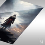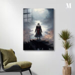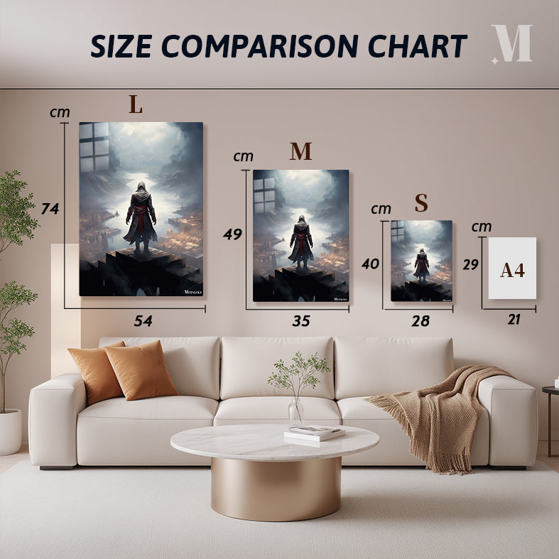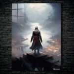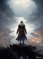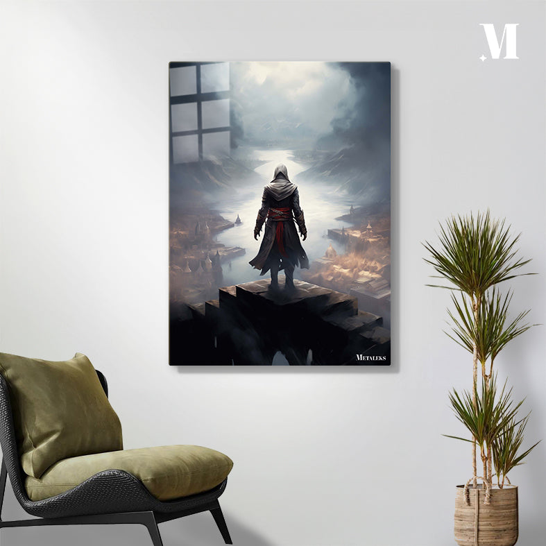 The subject is an assassin from the “Assassin’s Creed” series, standing on a high platform overlooking a misty, medieval-style city with a river running through it. Metaleks Ultra HD Metal Poster – Create Your Passionate Space.