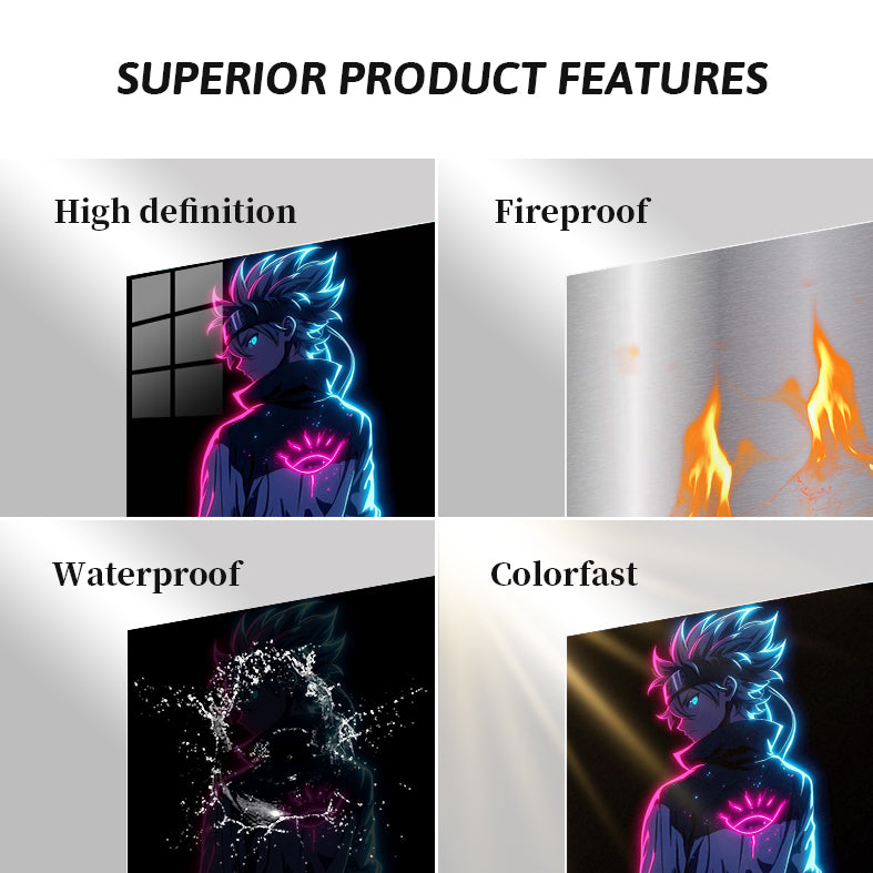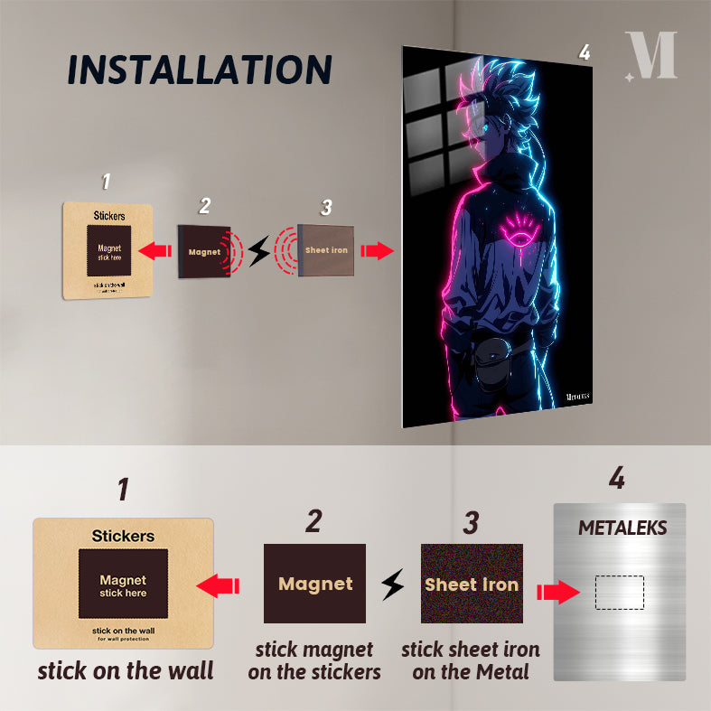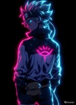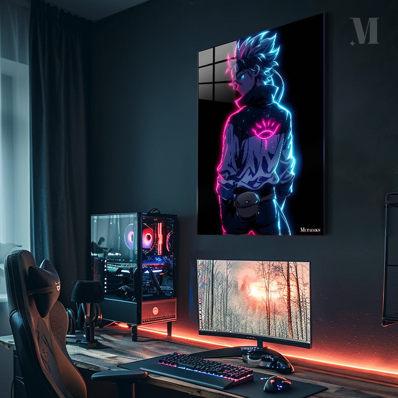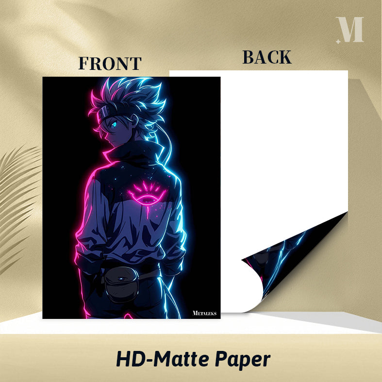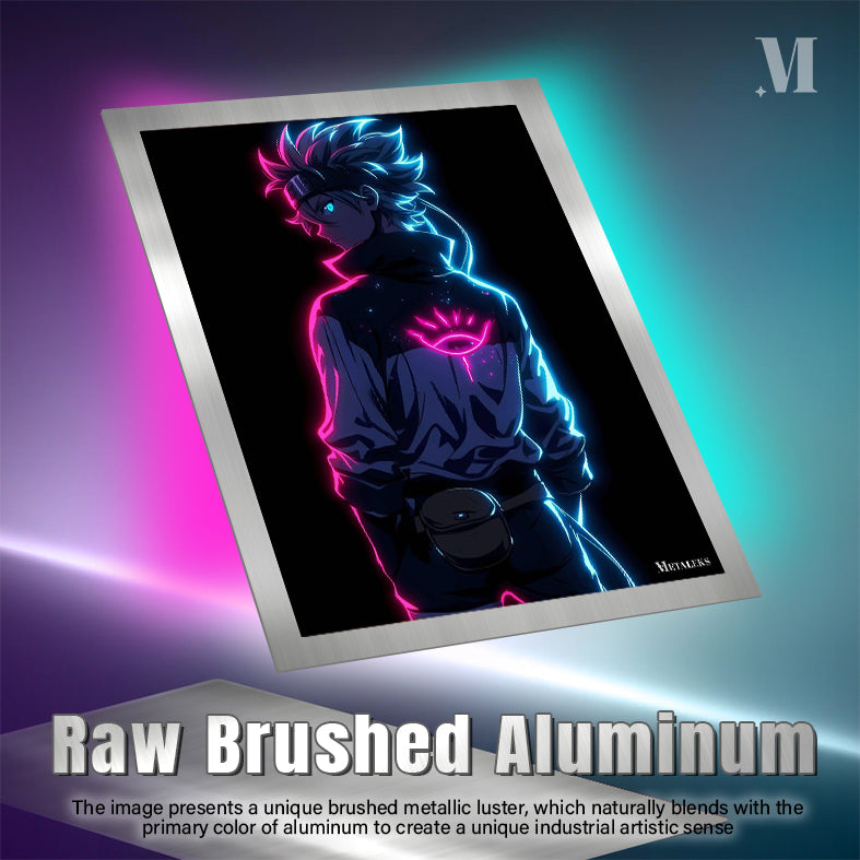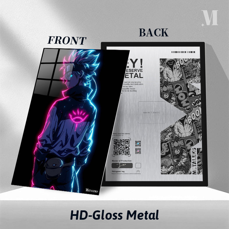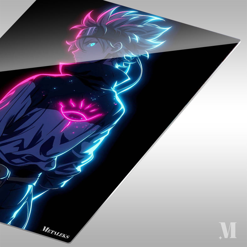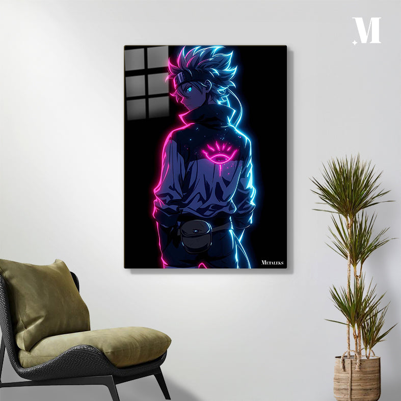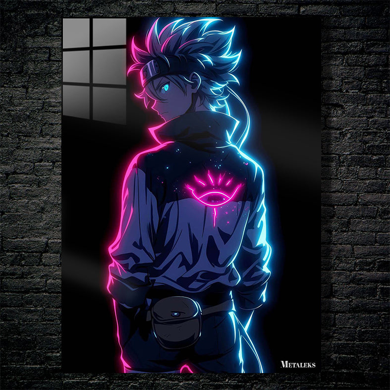 The image depicts a character with spiky hair, wearing a jacket with a glowing eye symbol on the back. The character has a headband and a pouch attached to their belt. The design features neon pink and blue lighting effects. Metaleks Ultra HD Metal Poster – Create Your Passionate Space.