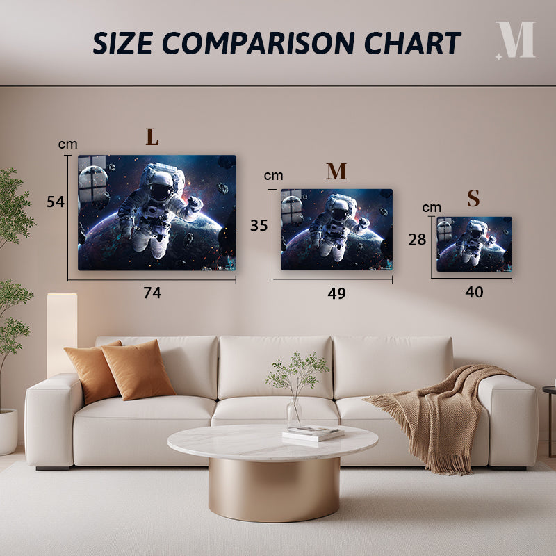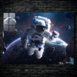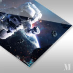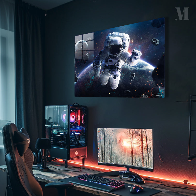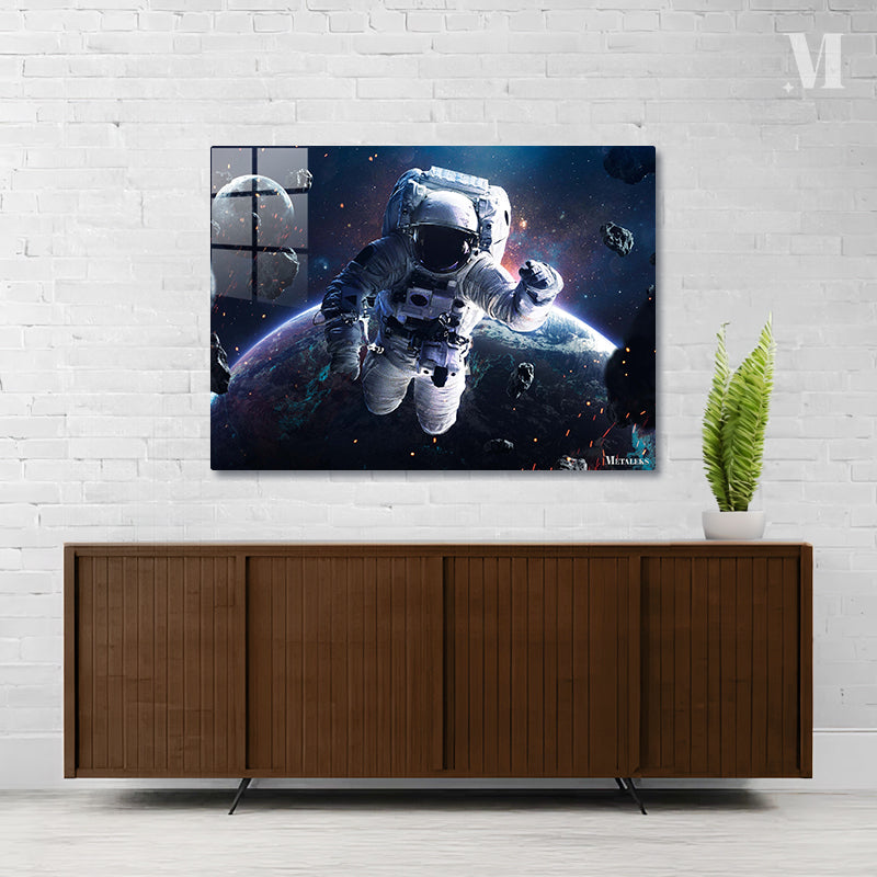 An astronaut in a white spacesuit is floating in space, surrounded by asteroids and with Earth visible in the background. Metaleks Ultra HD Metal Poster – Create Your Passionate Space.