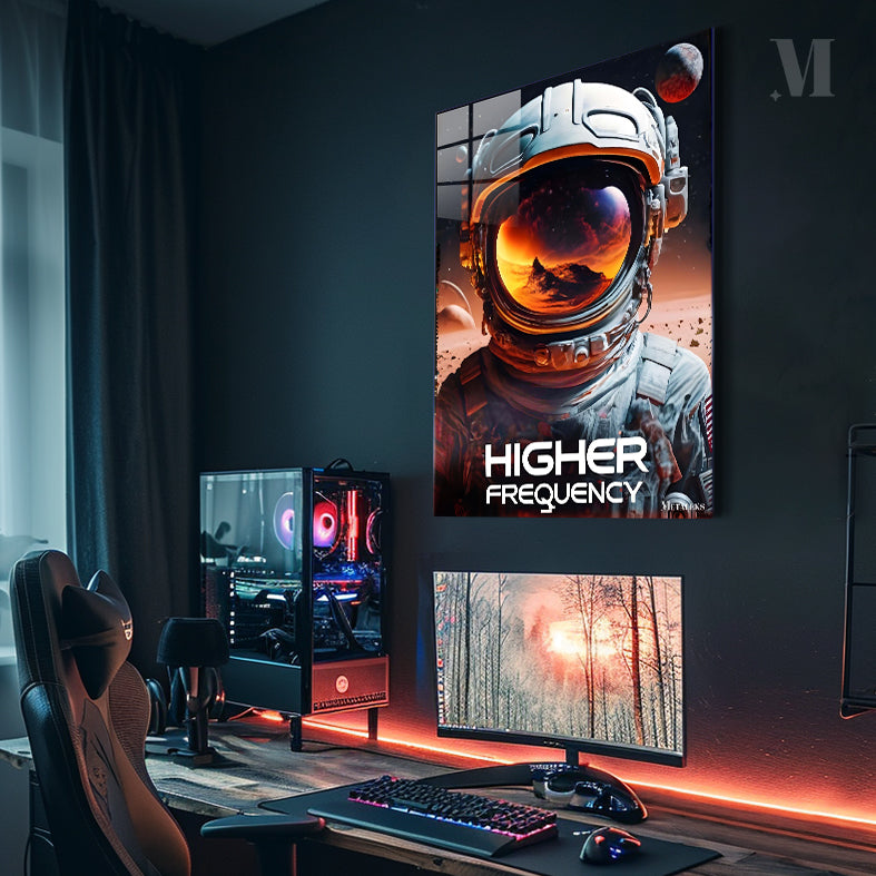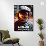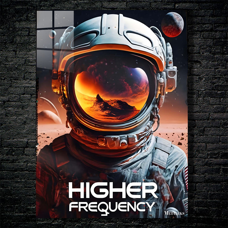 An astronaut’s helmet reflects a colorful, otherworldly landscape. Metaleks Ultra HD Metal Poster – Create Your Passionate Space.