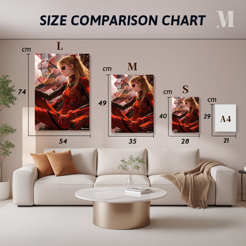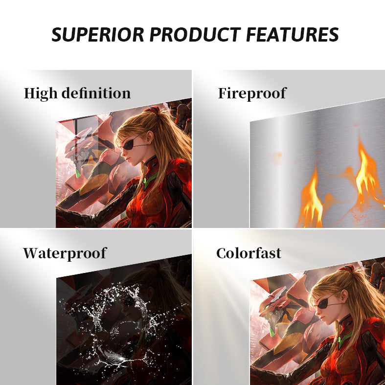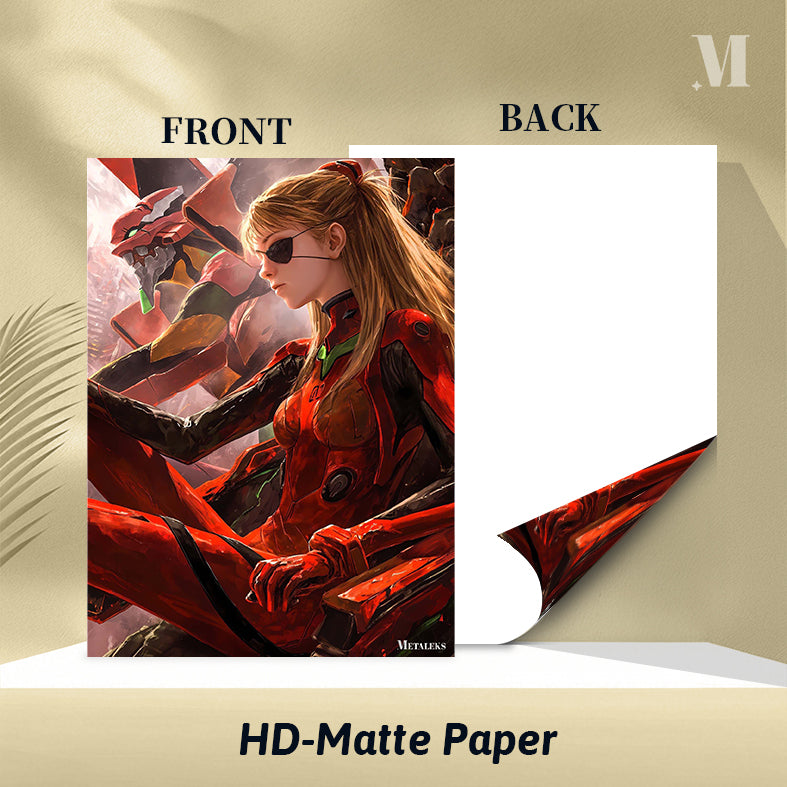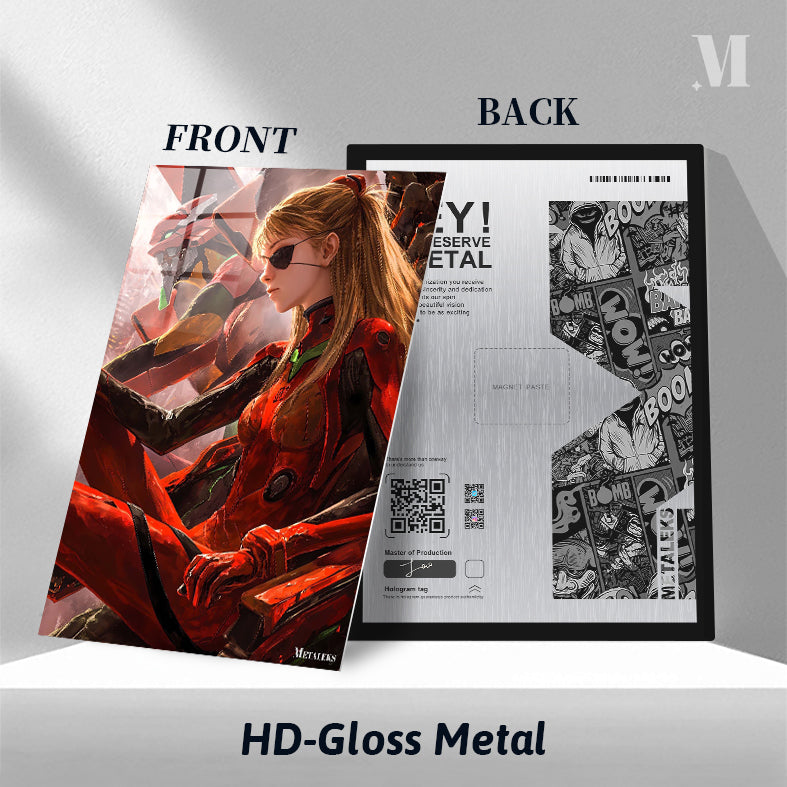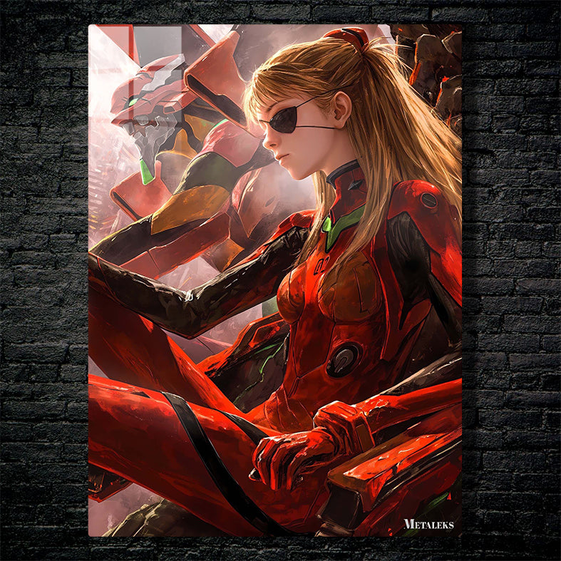 Asuka Langley Soryu from Neon Genesis Evangelion is wearing a red and black outfit. Metaleks Ultra HD Metal Poster – Create Your Passionate Space.