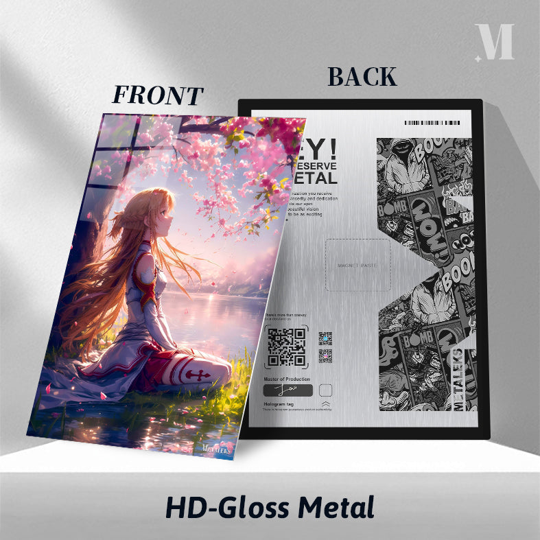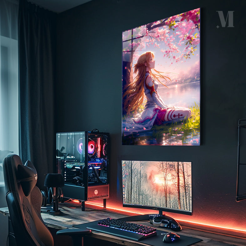 Asuna from Sword Art Online sits under a cherry blossom tree by a lake. She has long, flowing hair and is wearing a white and red outfit. Metaleks Ultra HD Metal Poster – Create Your Passionate Space.