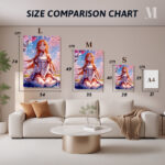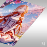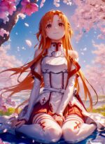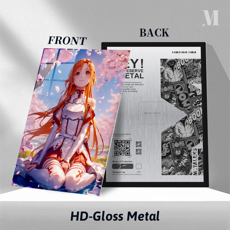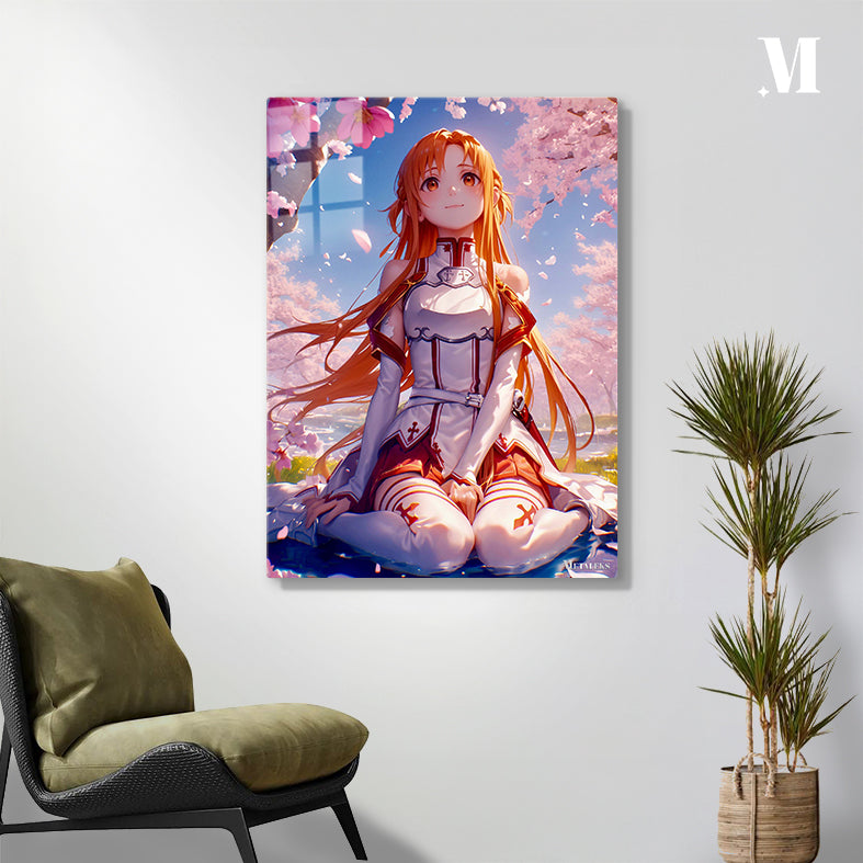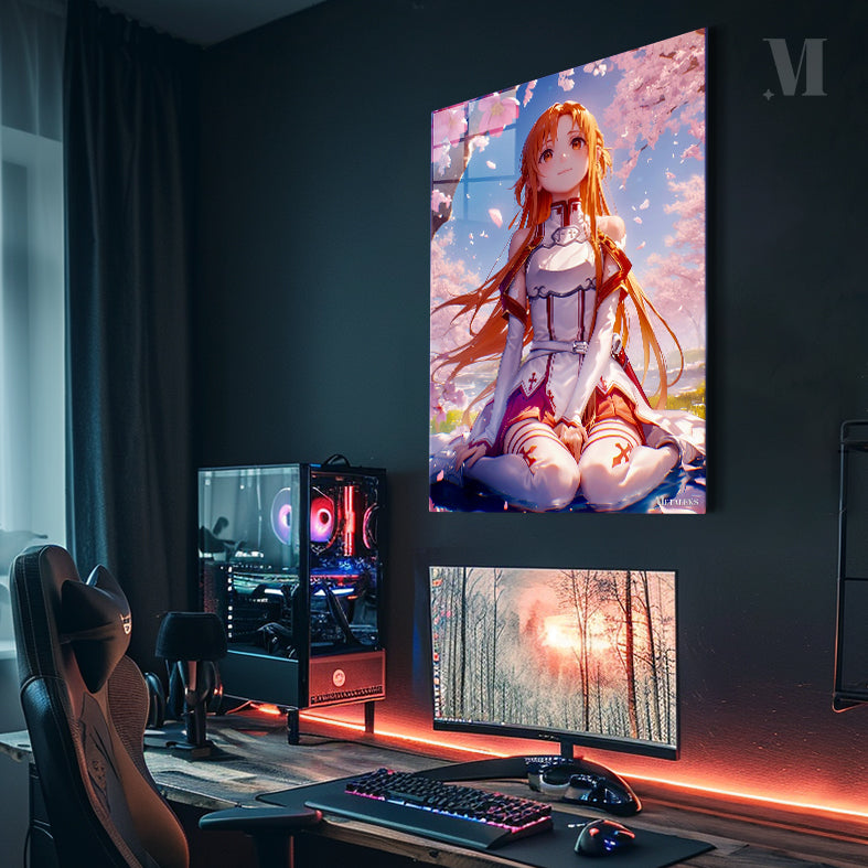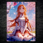Asuna, from the anime Sword Art Online, is sitting on the ground with her legs crossed. She has long orange hair and is wearing a white and red outfit. Metaleks Ultra HD Metal Poster – Create Your Passionate Space.