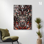 The image depicts a stylized, symmetrical representation of a demonic or monstrous face. It features sharp, angular lines and a color palette dominated by black, white, red, and gold. The eyes are prominent and glowing, and the mouth is filled with sharp teeth. Horns or spikes adorn the head, and the overall impression is one of aggression and menace.