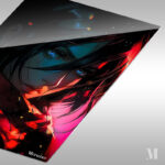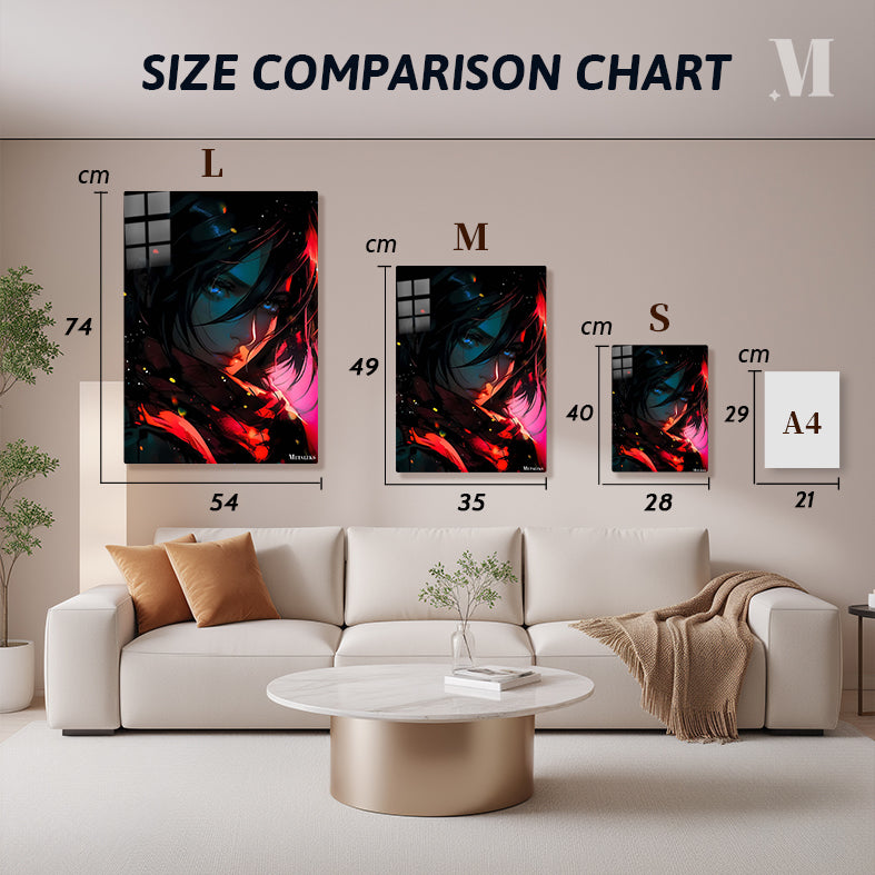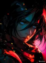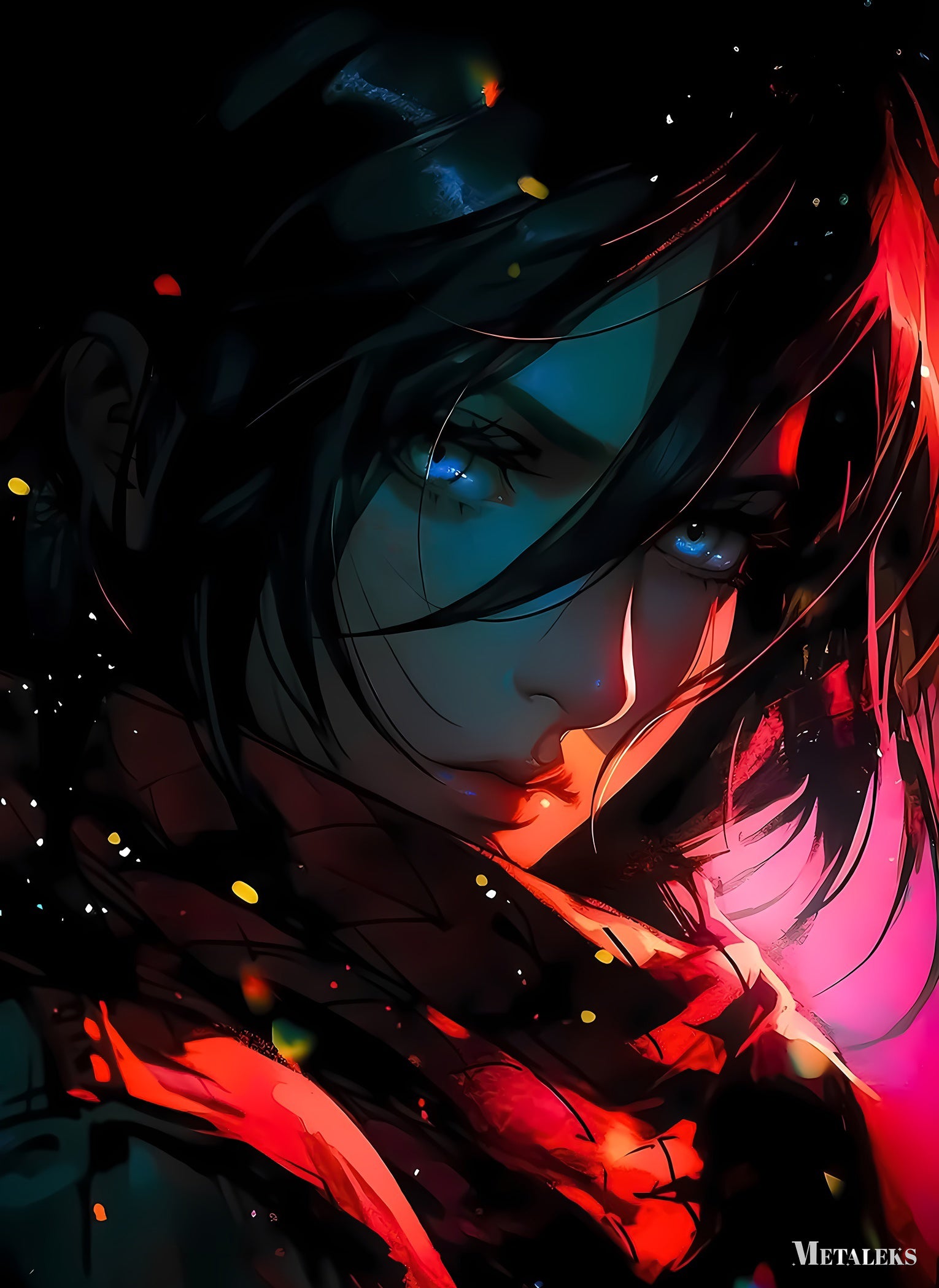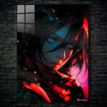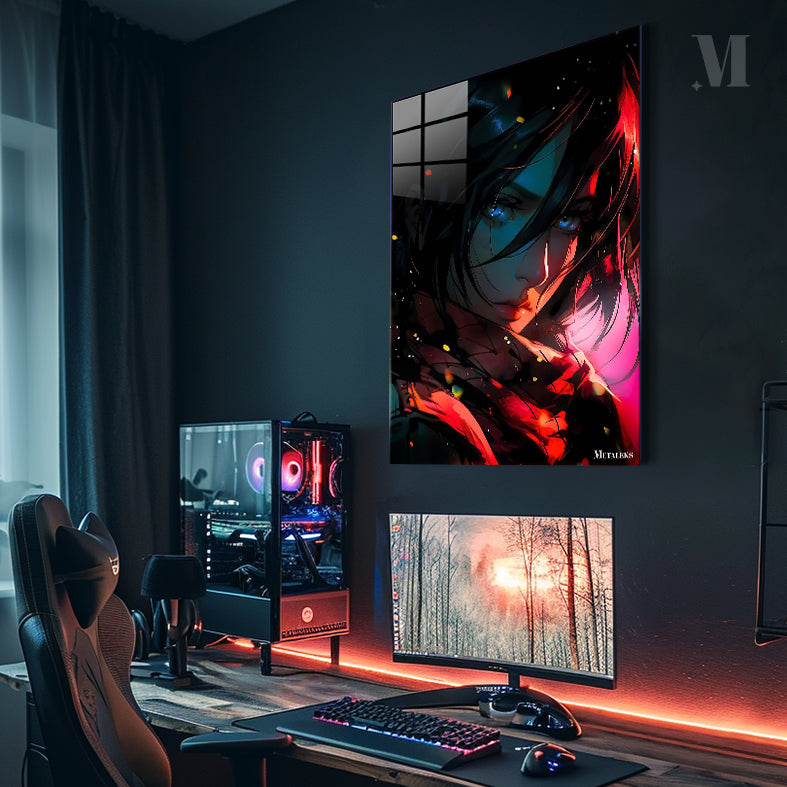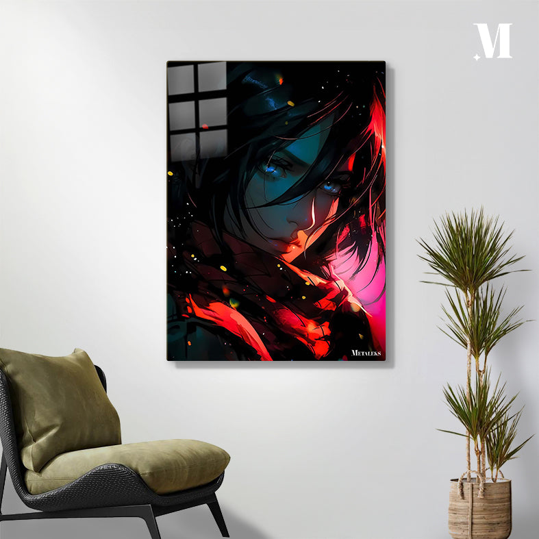 A character with long dark hair, blue eyes, and a red scarf. Metaleks Ultra HD Metal Poster – Create Your Passionate Space.