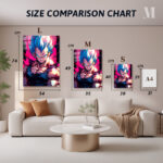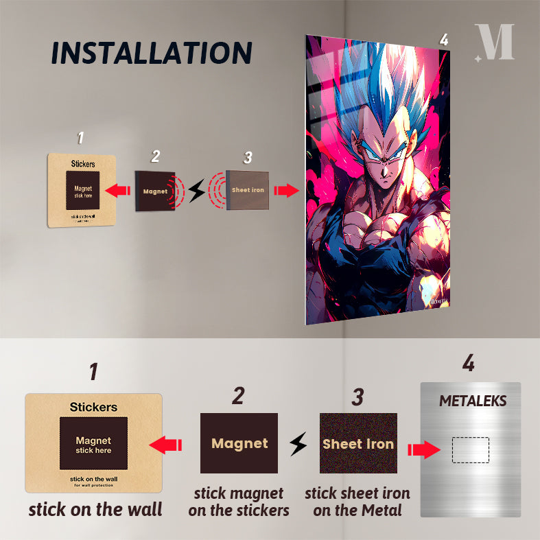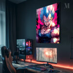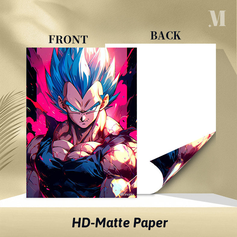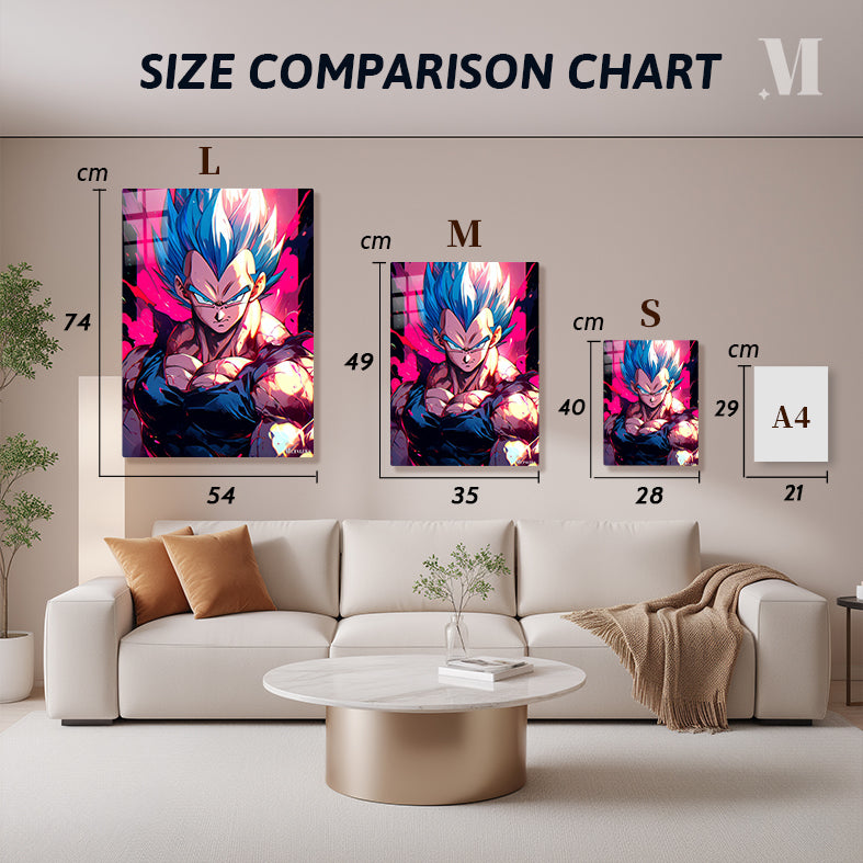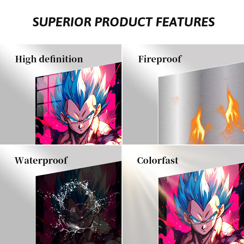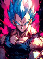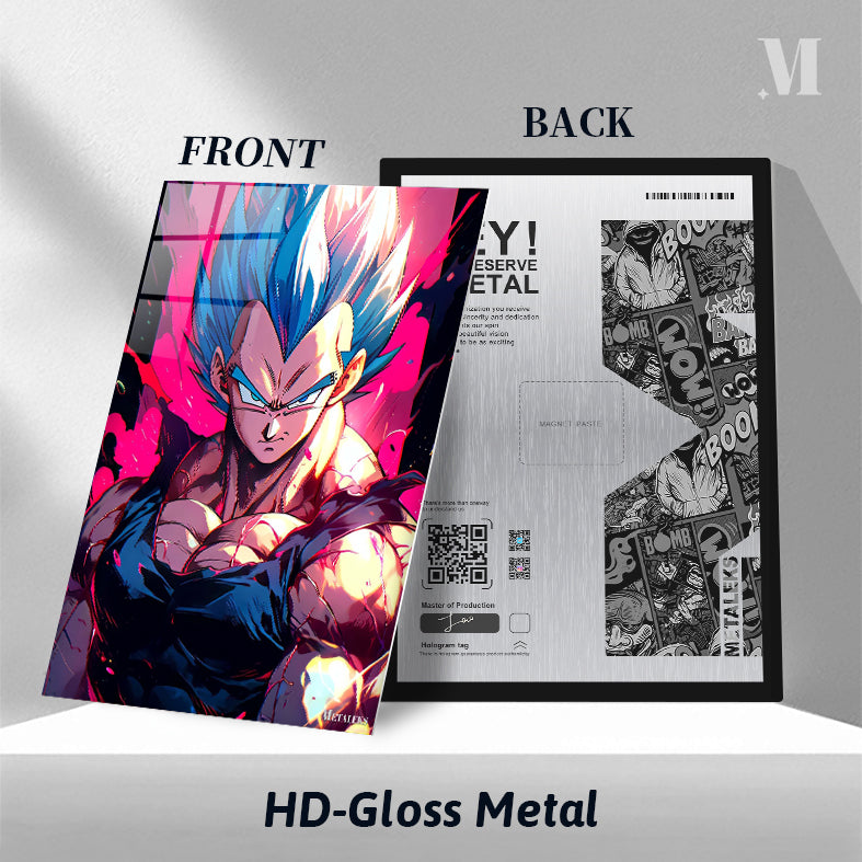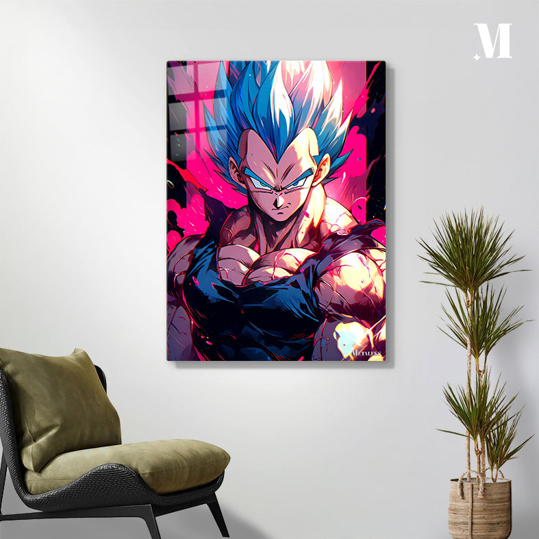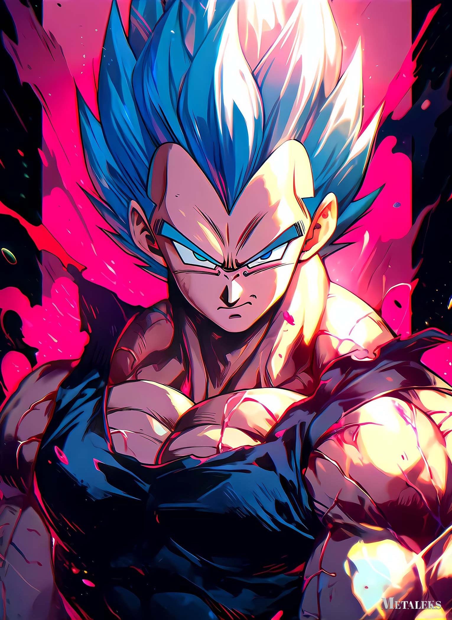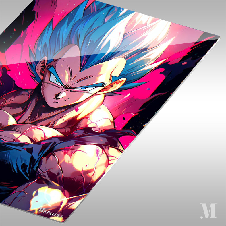 Vegeta, from Dragon Ball, has spiky blue hair and intense blue eyes. He wears a black battle suit with visible muscular definition. Metaleks Ultra HD Metal Poster – Create Your Passionate Space.