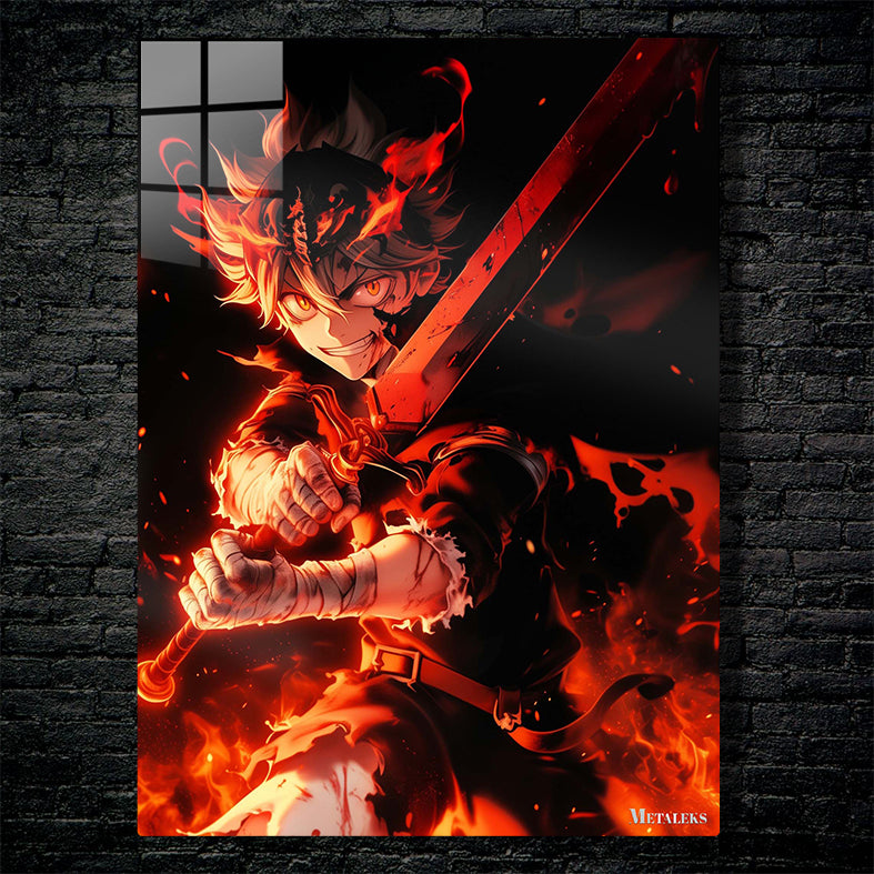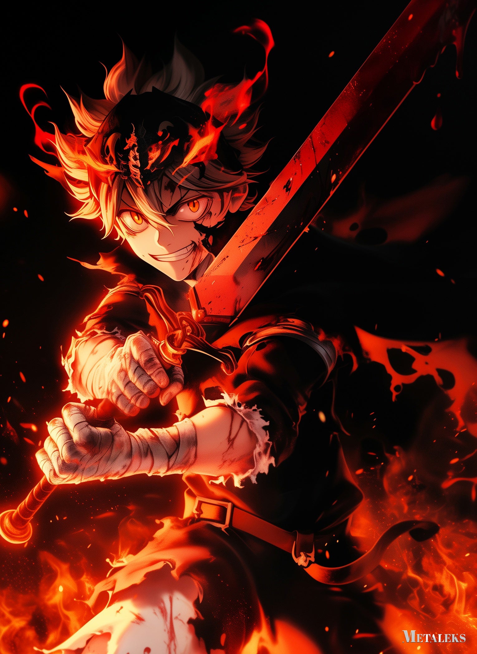 Asta from Black Clover is shown with a determined expression, holding a large sword. Flames are emanating from his head and body.