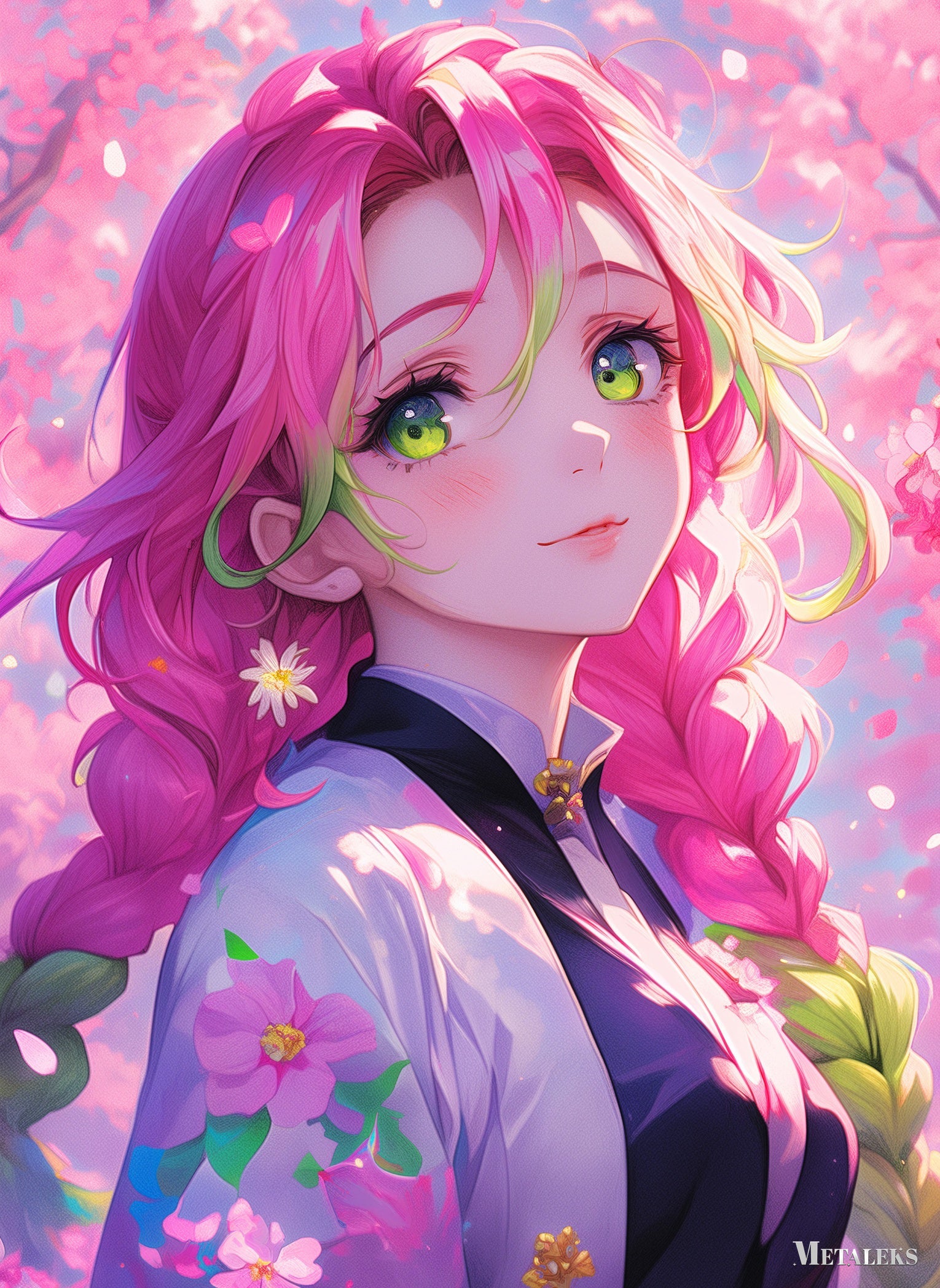 Mitsuri Kanroji from Demon Slayer has pink and green hair braided down her back. She is wearing a white kimono with pink flowers.