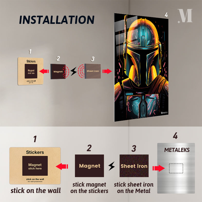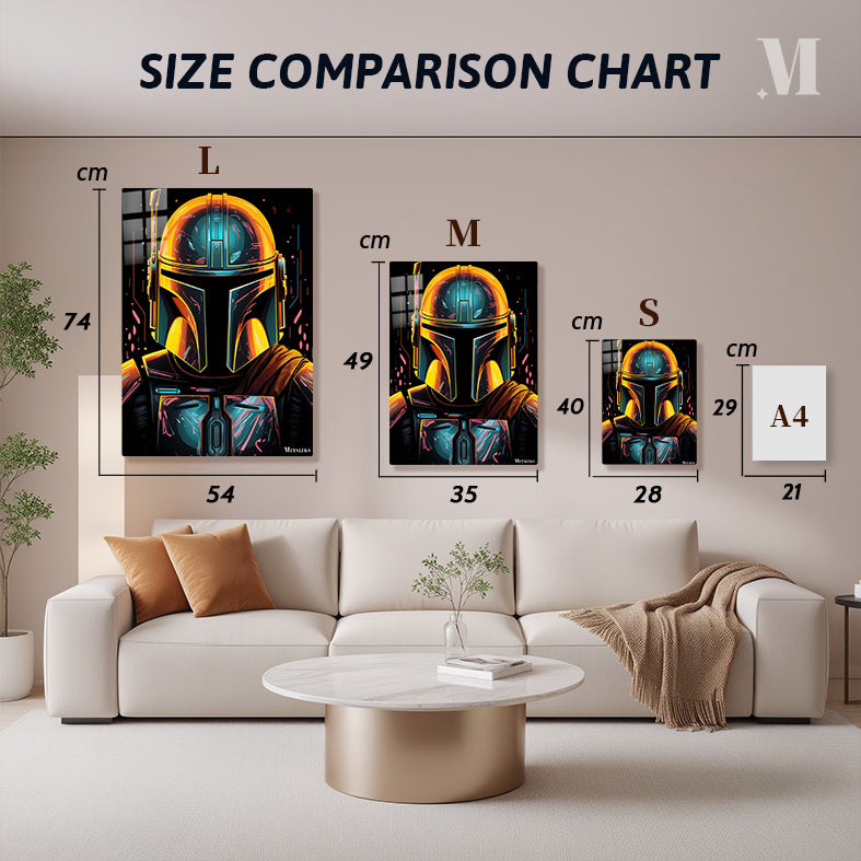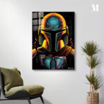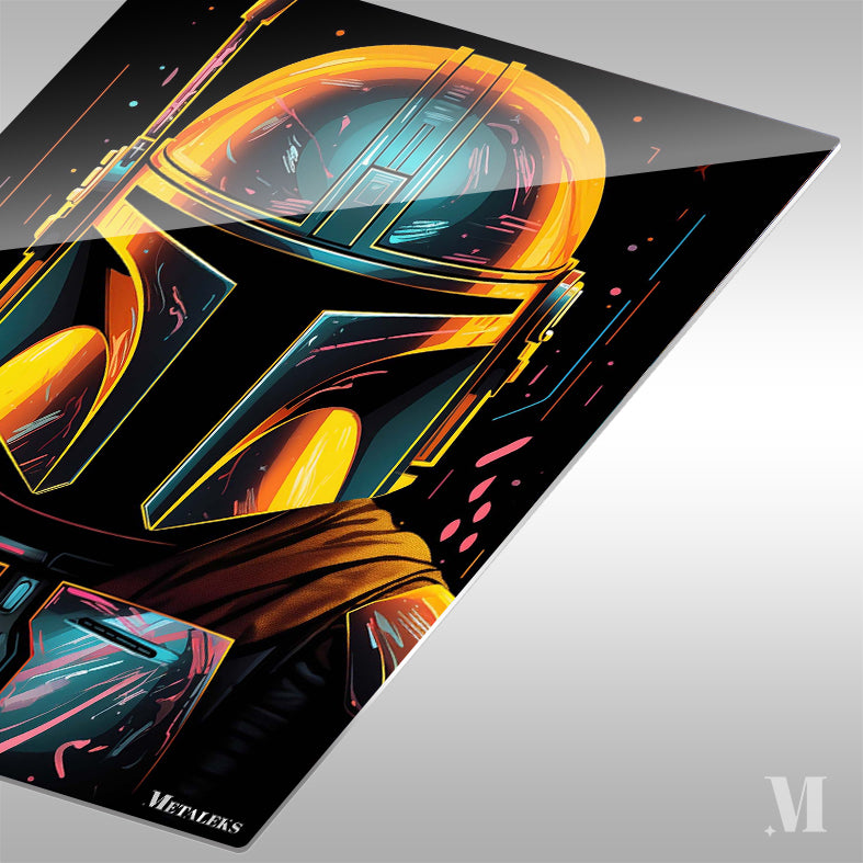The Mandalorian from the Star Wars series is depicted in a stylized, colorful illustration. The Mandalorian wears his iconic helmet with a T-shaped visor and armor, featuring a mix of orange, blue, and black hues. Metaleks Ultra HD Metal Poster – Create Your Passionate Space.