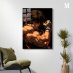 A muscular man with dark hair and red eyes, wearing a sleeveless shirt and wrist wraps, strikes a dynamic pose. Metaleks Ultra HD Metal Poster – Create Your Passionate Space.