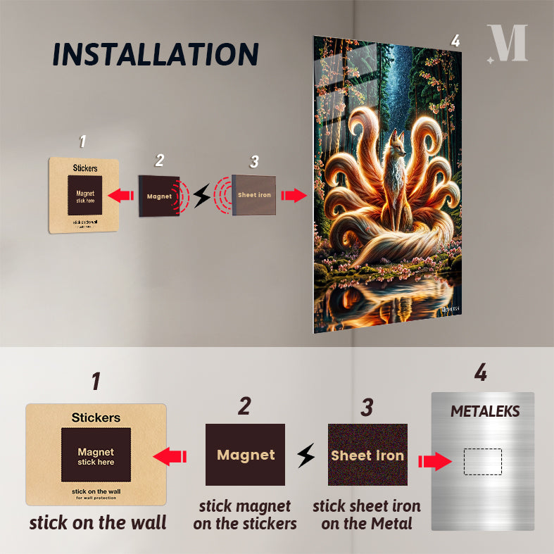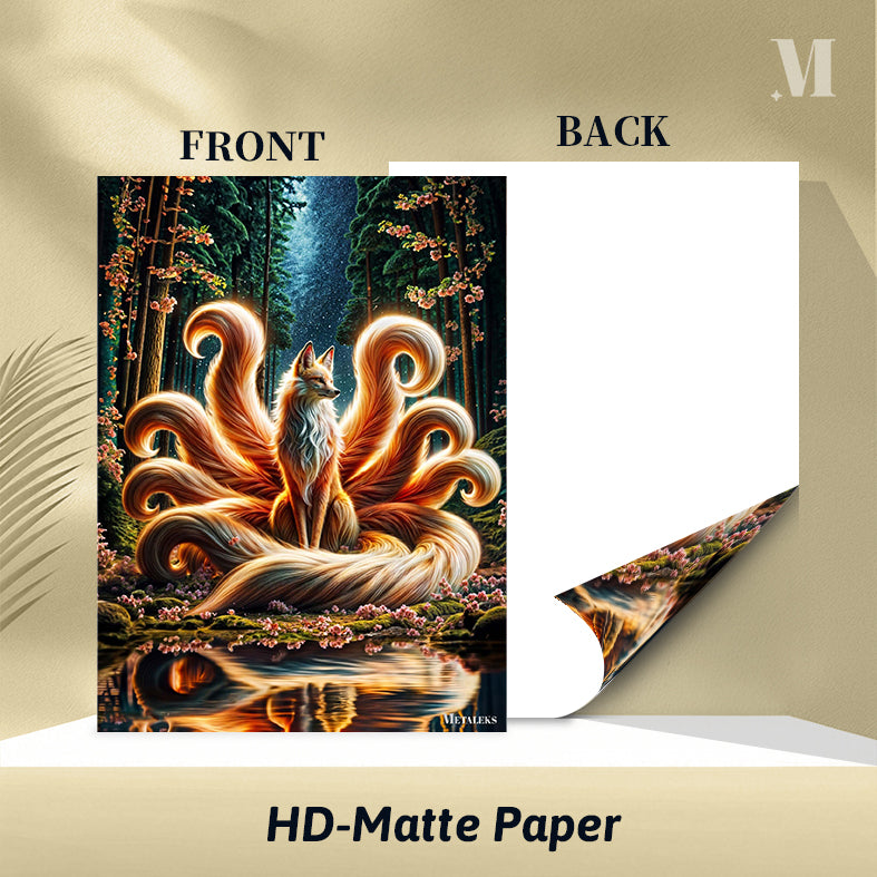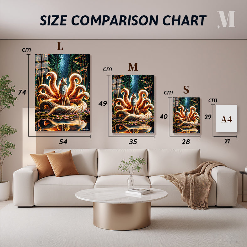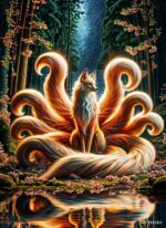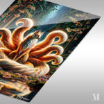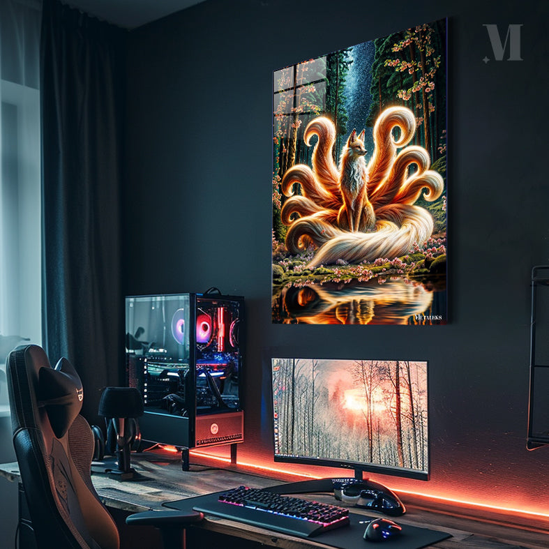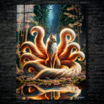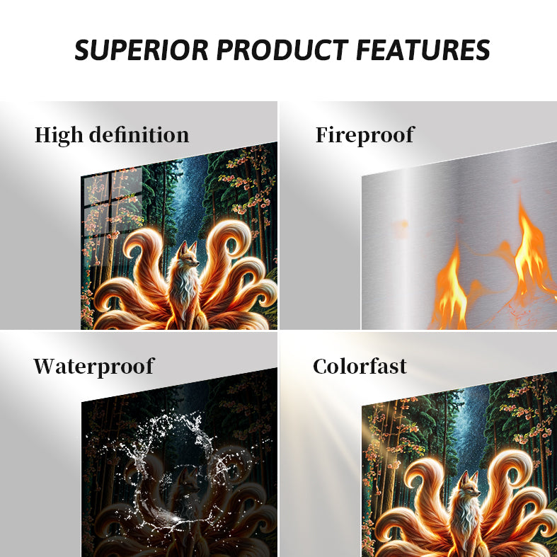 A nine-tailed fox with glowing, flowing tails sits in a forest. Metaleks Ultra HD Metal Poster – Create Your Passionate Space.
