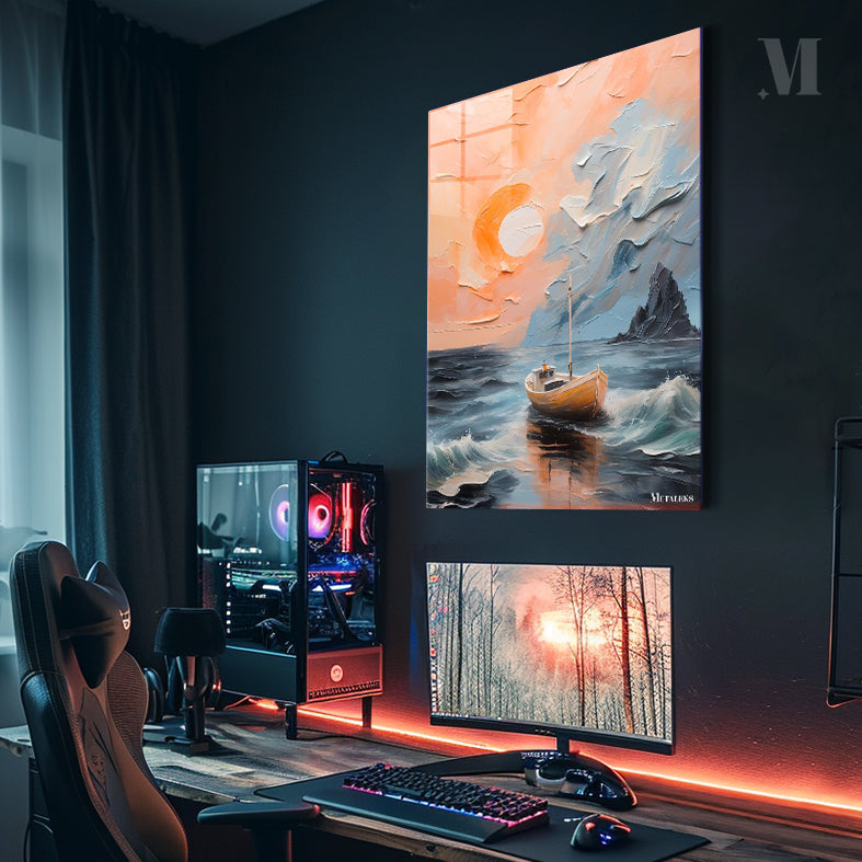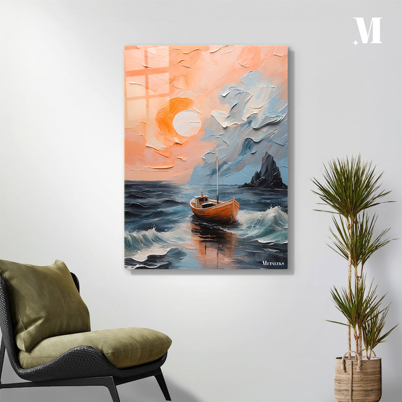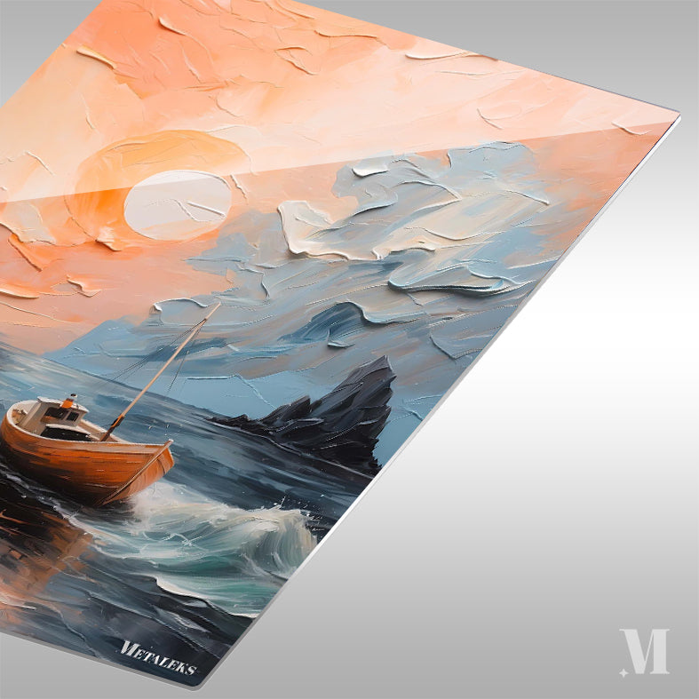 A small boat floats on a calm sea, with waves gently lapping at its sides. The sun is setting, casting a warm orange glow across the sky. A rocky outcrop is visible in the background. Metaleks Ultra HD Metal Poster – Create Your Passionate Space.