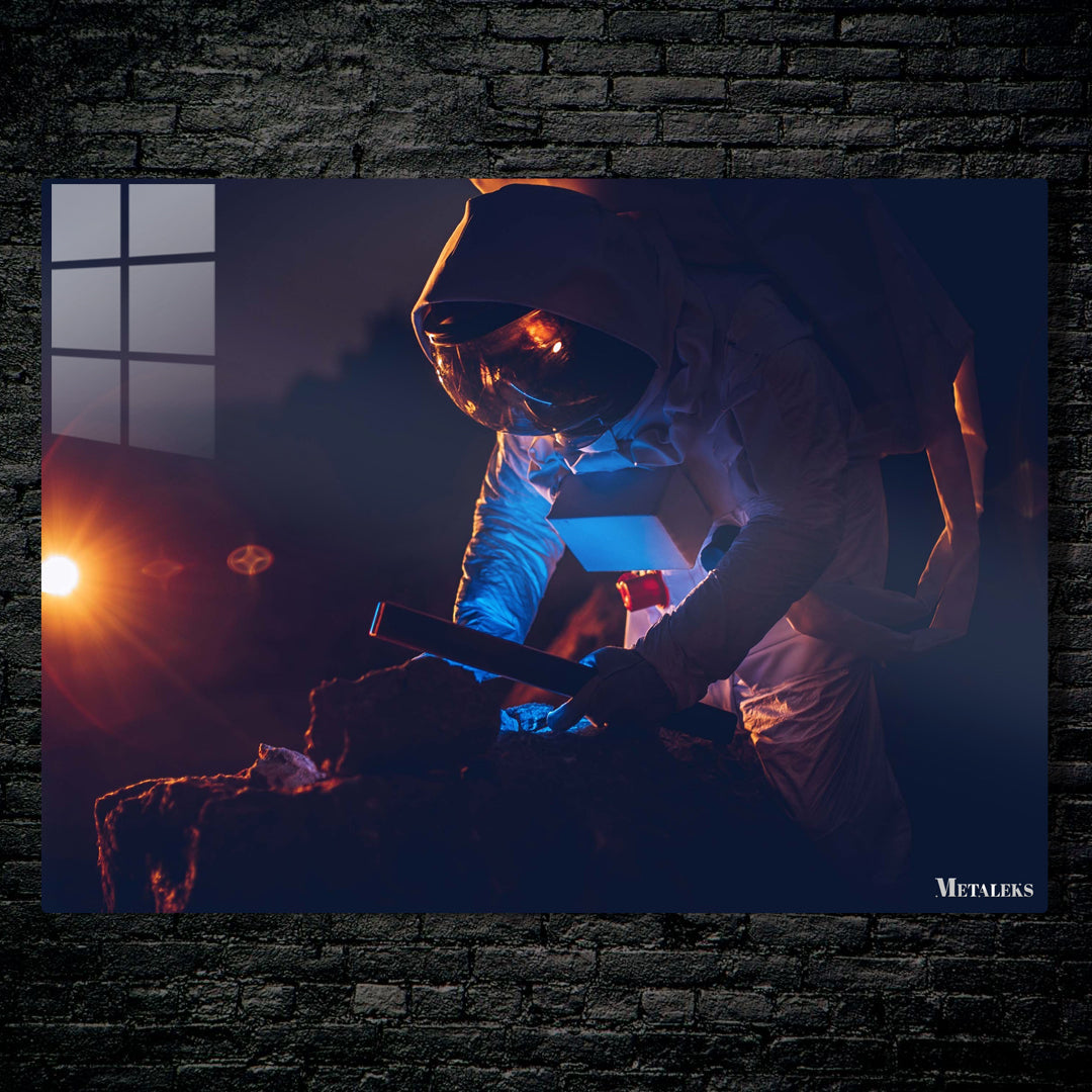 An astronaut is working on a rock. Metaleks Ultra HD Metal Poster – Create Your Passionate Space.