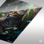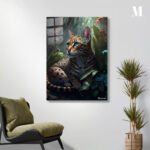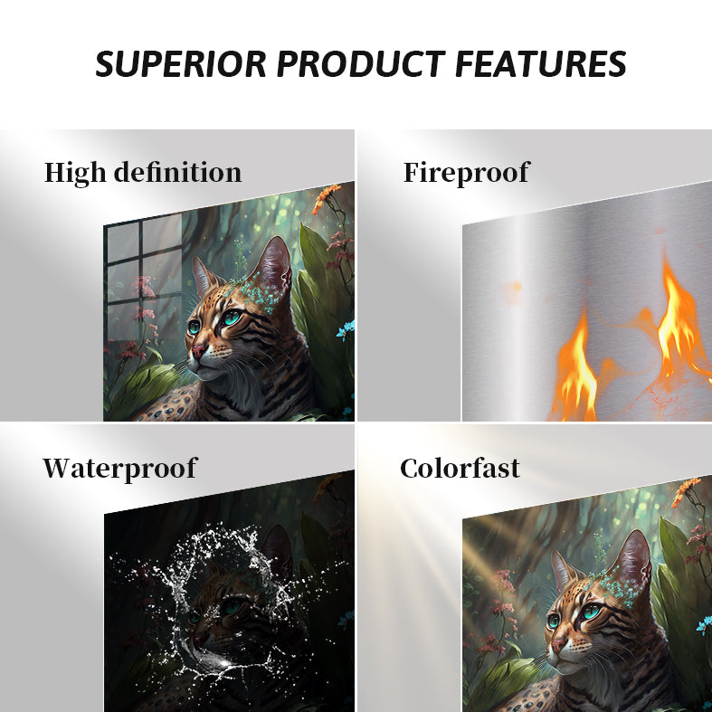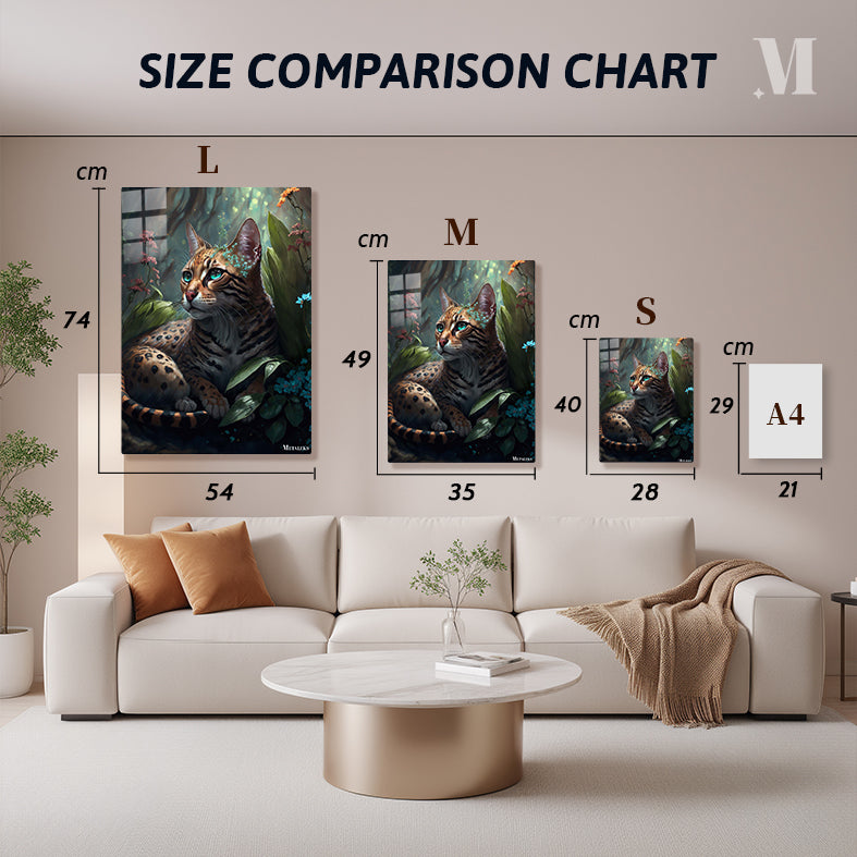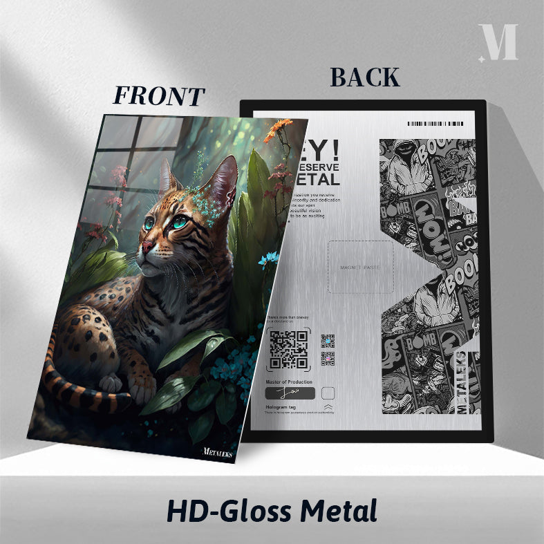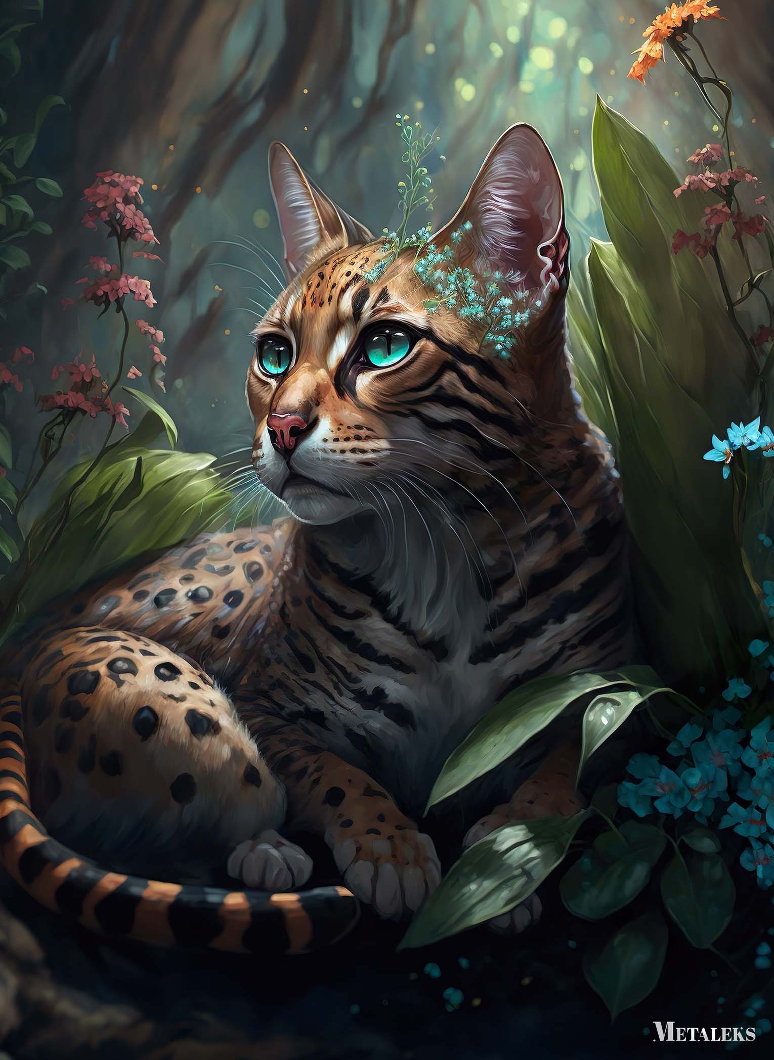 A wild cat with a spotted and striped coat lies among lush green leaves and colorful flowers. The cat has striking blue-green eyes and a small floral crown on its head. Metaleks Ultra HD Metal Poster – Create Your Passionate Space.