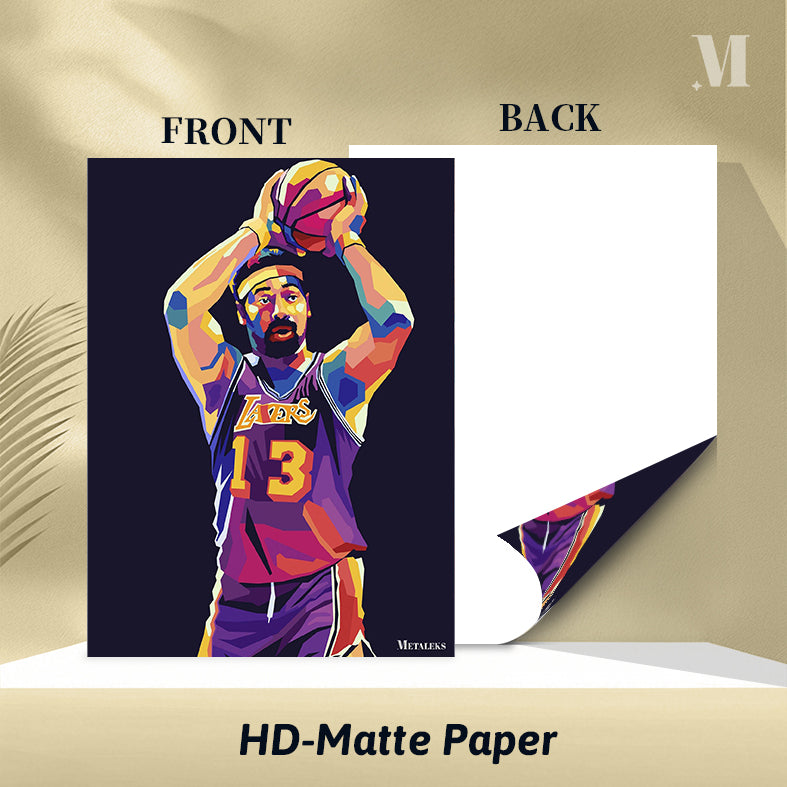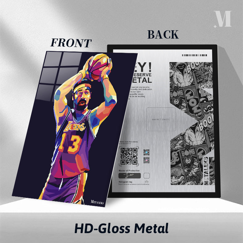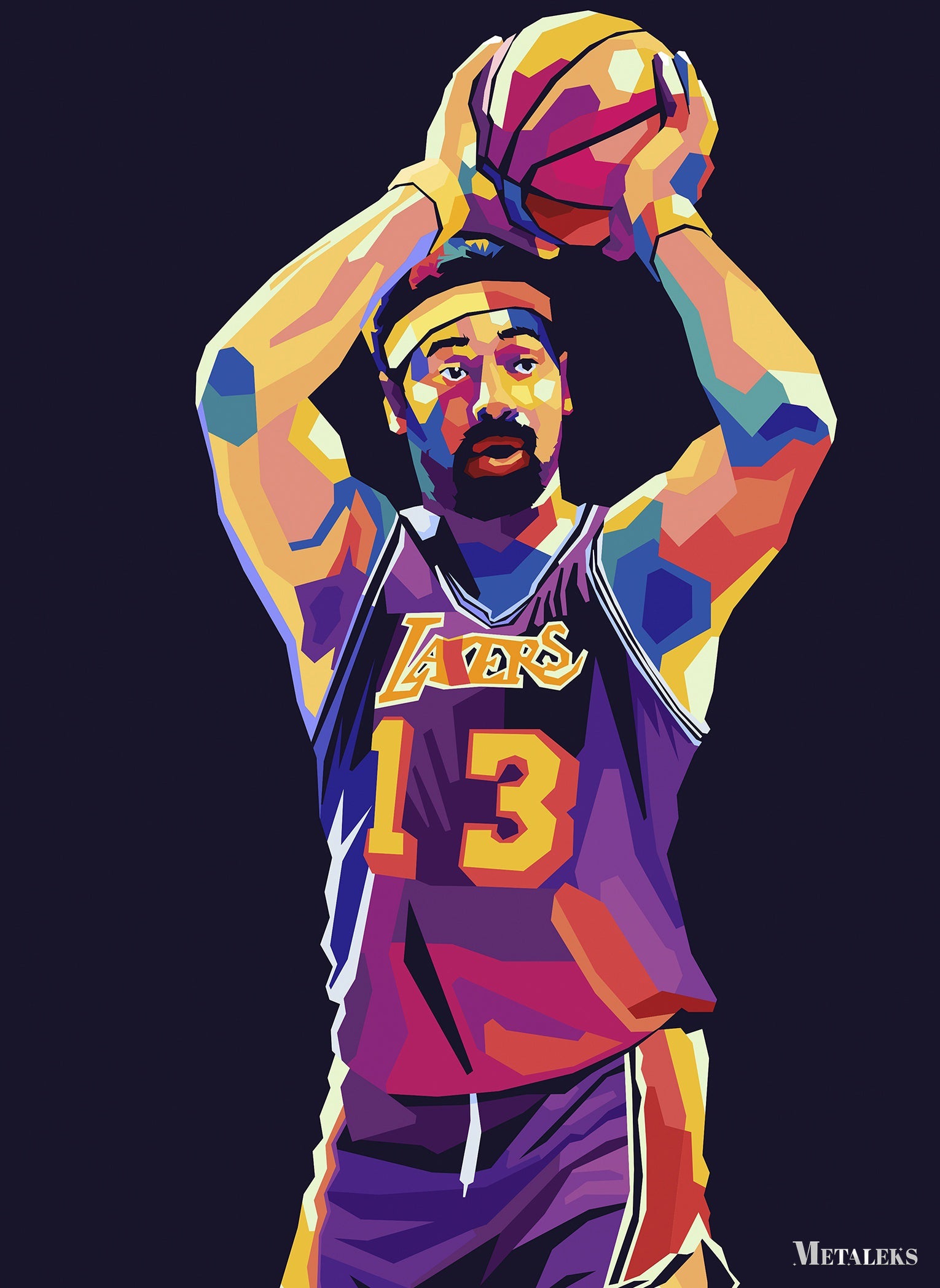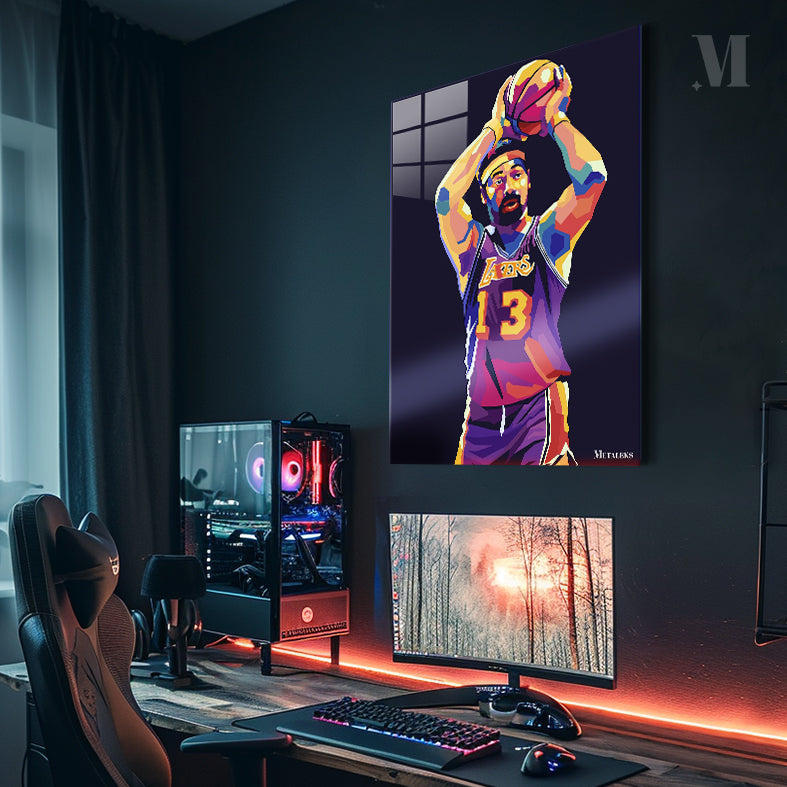 The image depicts Wilt Chamberlain, a basketball player from the Los Angeles Lakers, wearing a purple jersey with the number 13. He is holding a basketball above his head, preparing to shoot. Metaleks Ultra HD Metal Poster – Create Your Passionate Space.