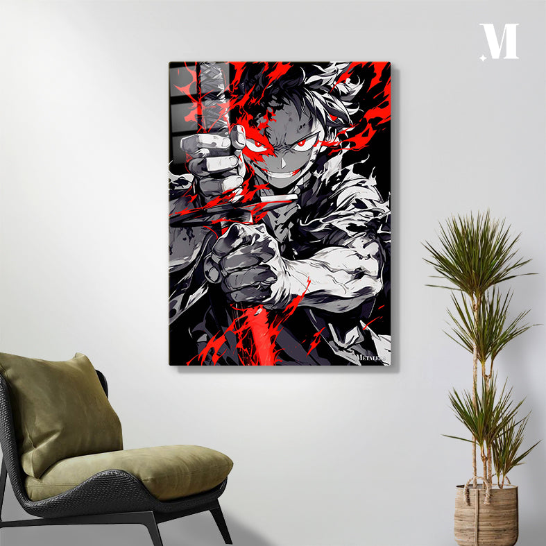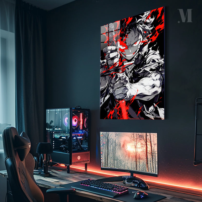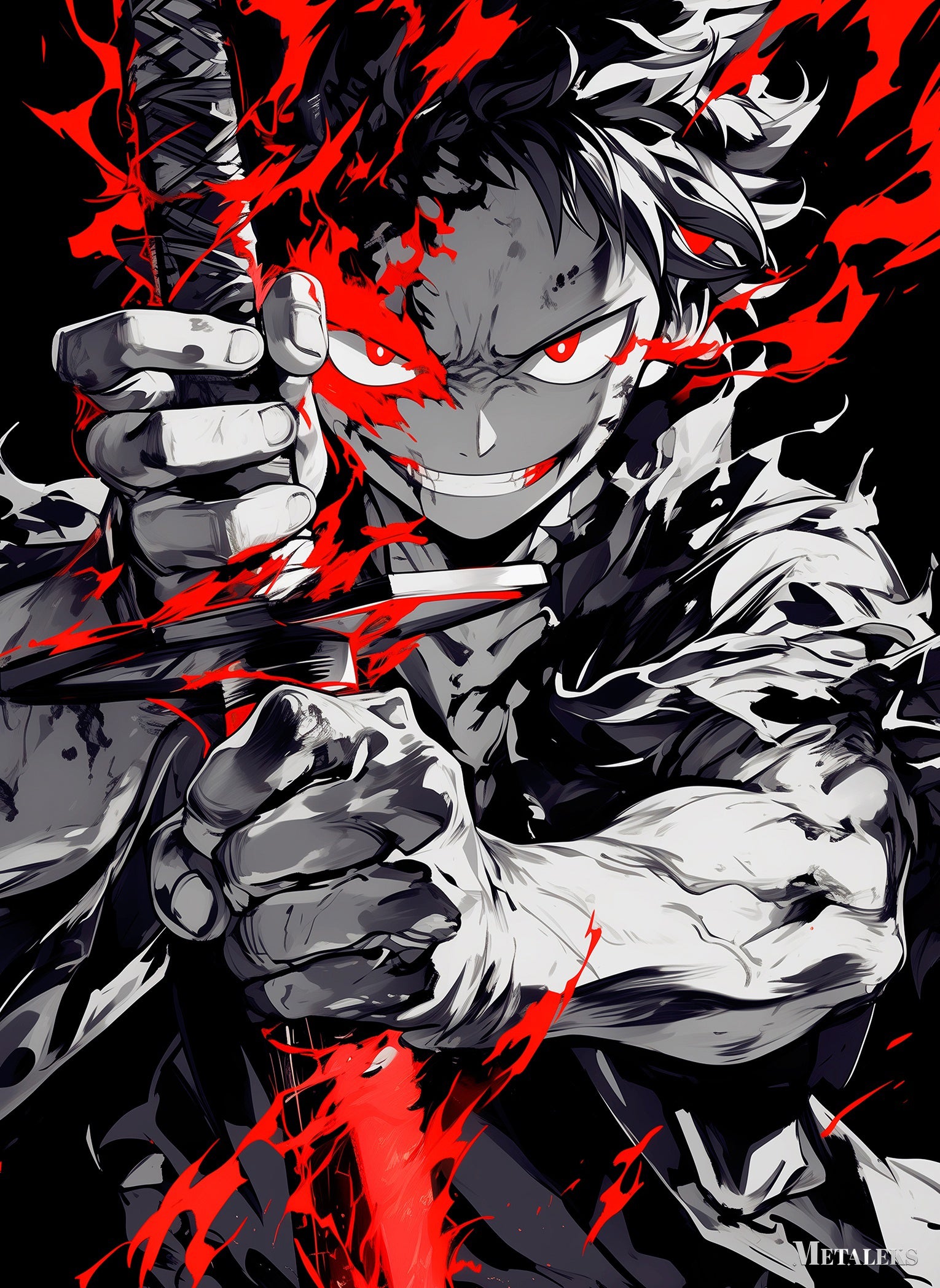 Izuku Midoriya from “My Hero Academia” is depicted with a menacing expression, red eyes, and a wide grin. He is holding a sword with both hands, and red streaks emanate from the blade and around his face, creating a dynamic and intense atmosphere.