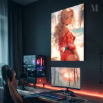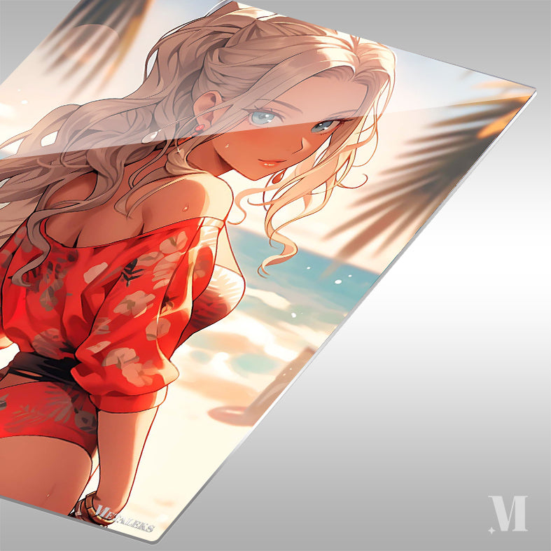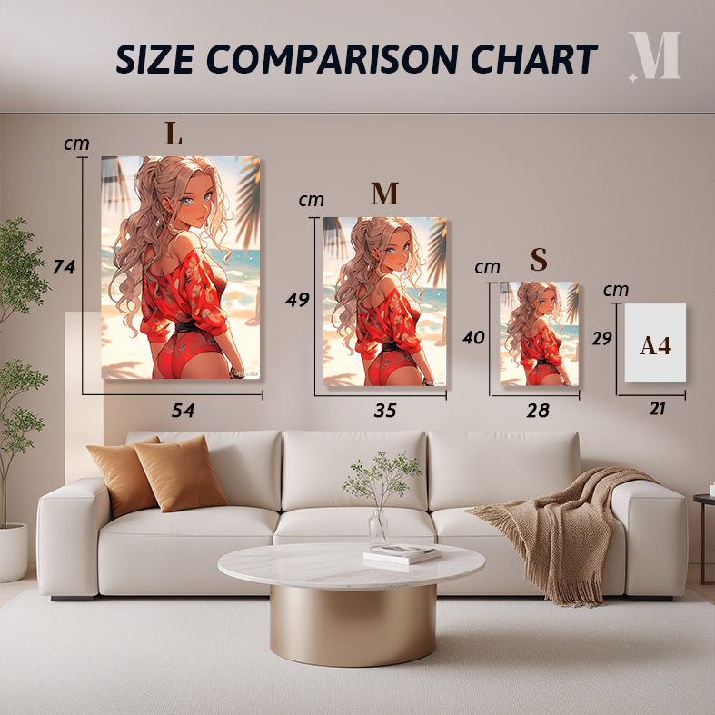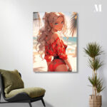A woman with long, wavy blonde hair, wearing a red floral off-shoulder top and matching red swimsuit, stands on a beach. Metaleks Ultra HD Metal Poster – Create Your Passionate Space.