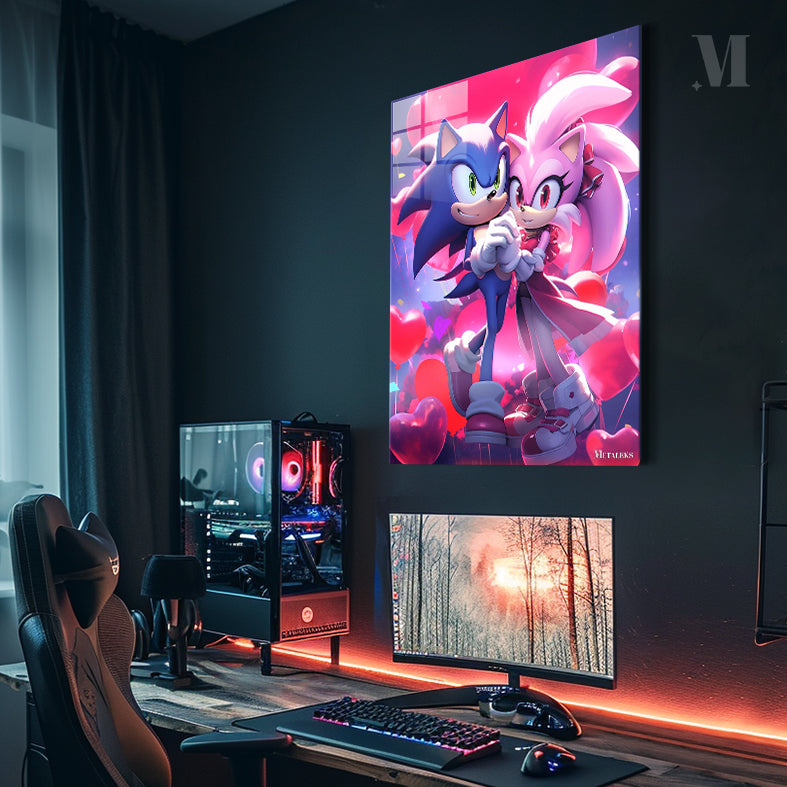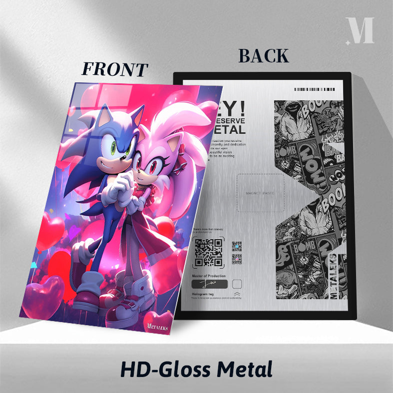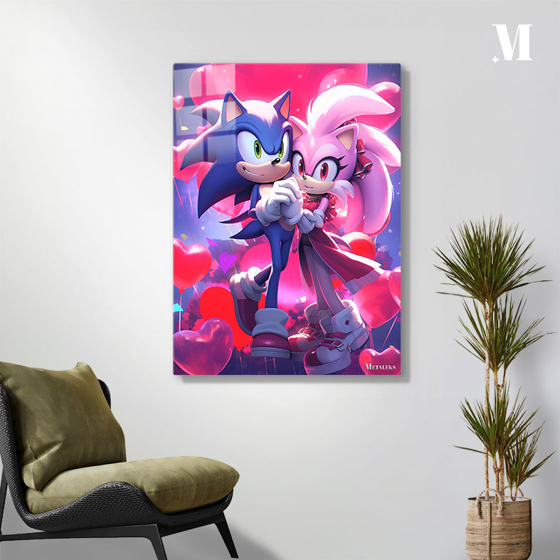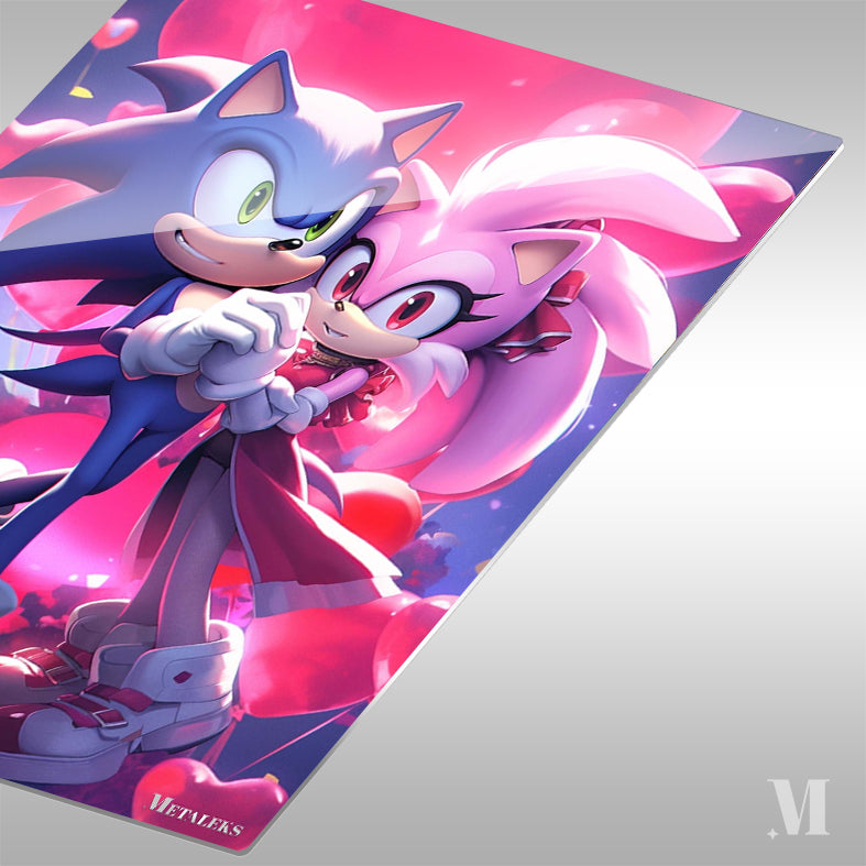 Sonic and Amy from the Sonic the Hedgehog series are holding hands. Sonic is blue with green eyes, and Amy is pink with red eyes. They are surrounded by heart-shaped balloons. Metaleks Ultra HD Metal Poster – Create Your Passionate Space.