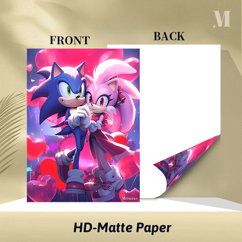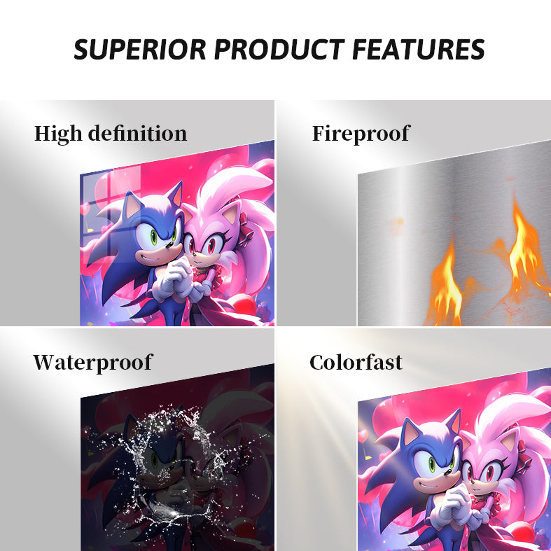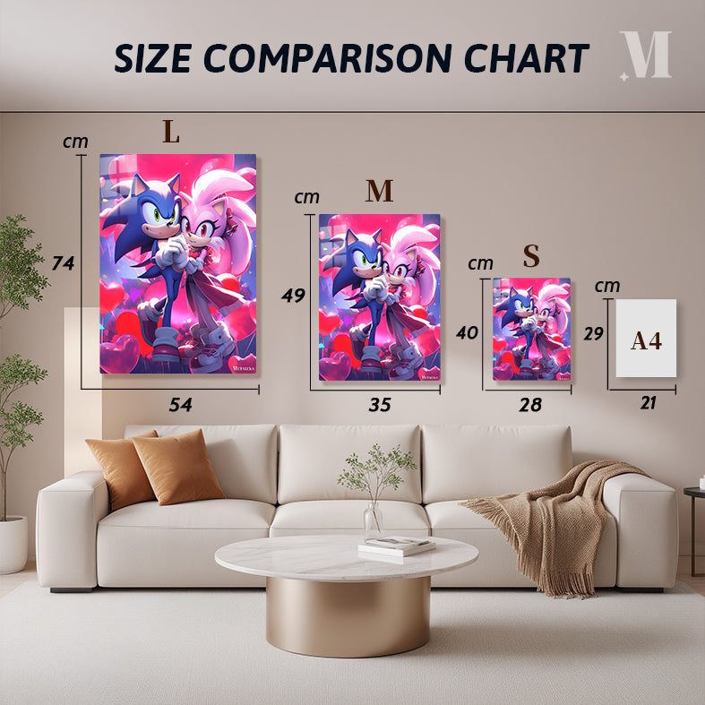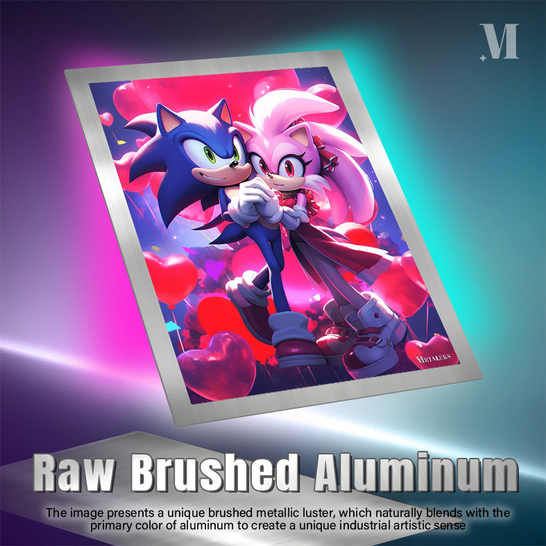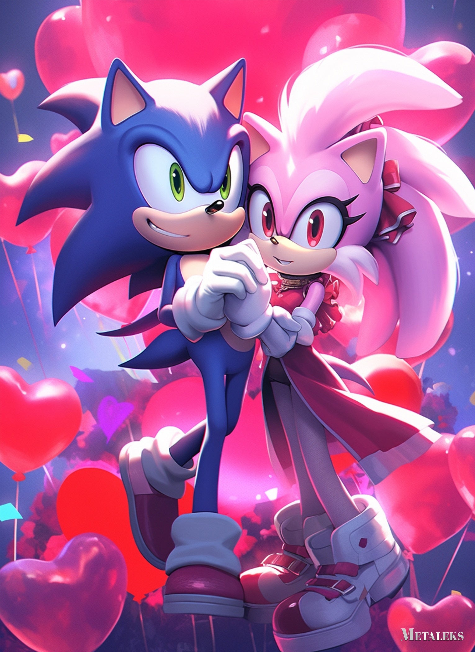 Sonic and Amy from the Sonic the Hedgehog series are holding hands. Sonic is blue with green eyes, and Amy is pink with red eyes. They are surrounded by heart-shaped balloons. Metaleks Ultra HD Metal Poster – Create Your Passionate Space.