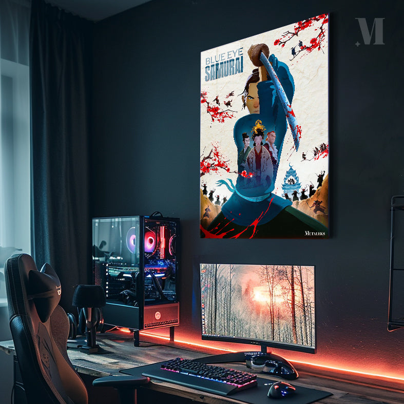 A character from “Blue Eye Samurai” is holding a sword with blood on it. Behind the character, there are three other characters: one in traditional Japanese attire with a headdress, another in a green robe, and a third in a white shirt. Metaleks Ultra HD Metal Poster – Create Your Passionate Space.
