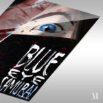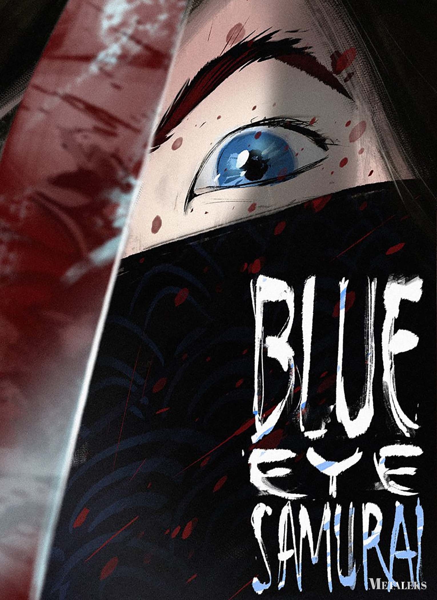 A person with a blue eye is partially covered by a dark cloth with red splatters. There is a bloodied blade next to them. The text “BLUE EYE SAMURAI” is prominently displayed. Metaleks Ultra HD Metal Poster – Create Your Passionate Space.