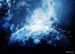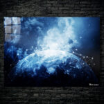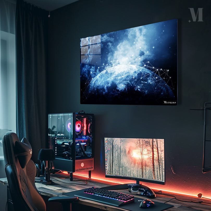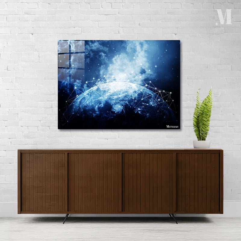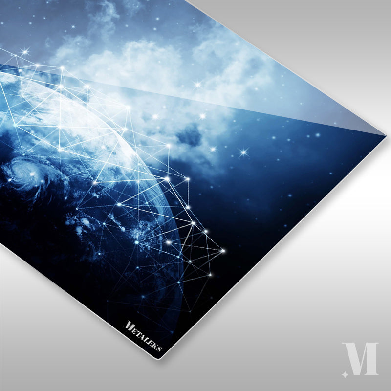 A globe is surrounded by a network of lines and nodes, set against a backdrop of stars and clouds. Metaleks Ultra HD Metal Poster – Create Your Passionate Space.